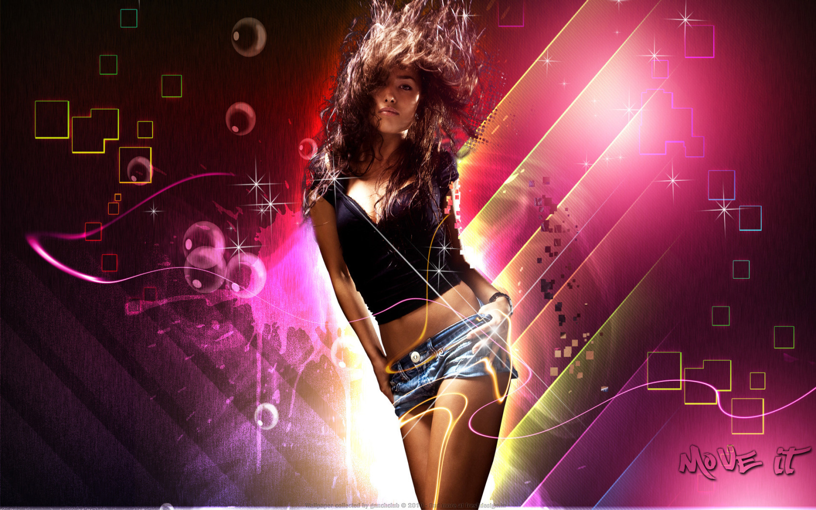 Description: A woman in a short skirt and a black top with a colorful background and a design of squares and circles.