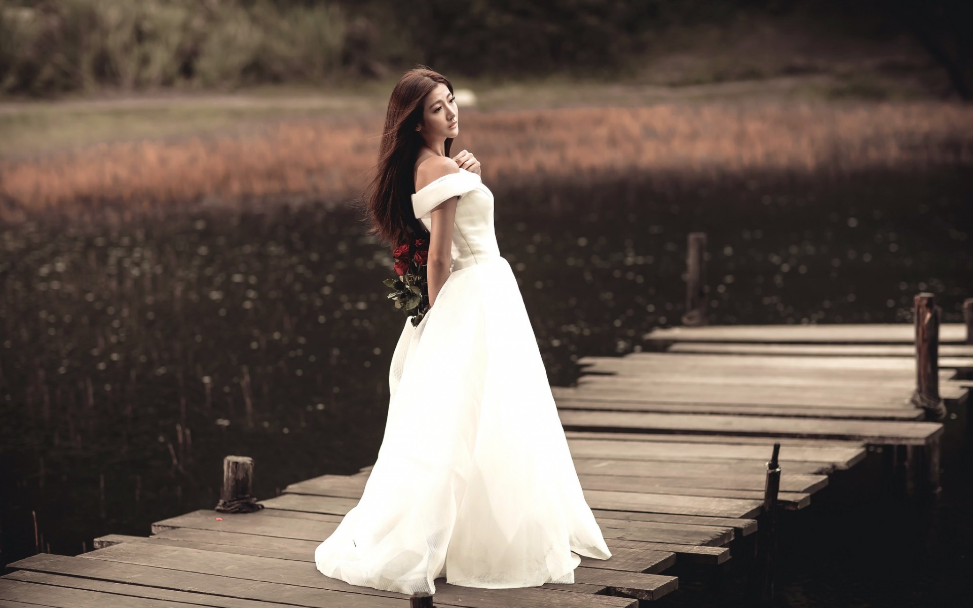 Description: A woman in a white dress is standing on a dock near a lake and holding a bouquet of flowers.