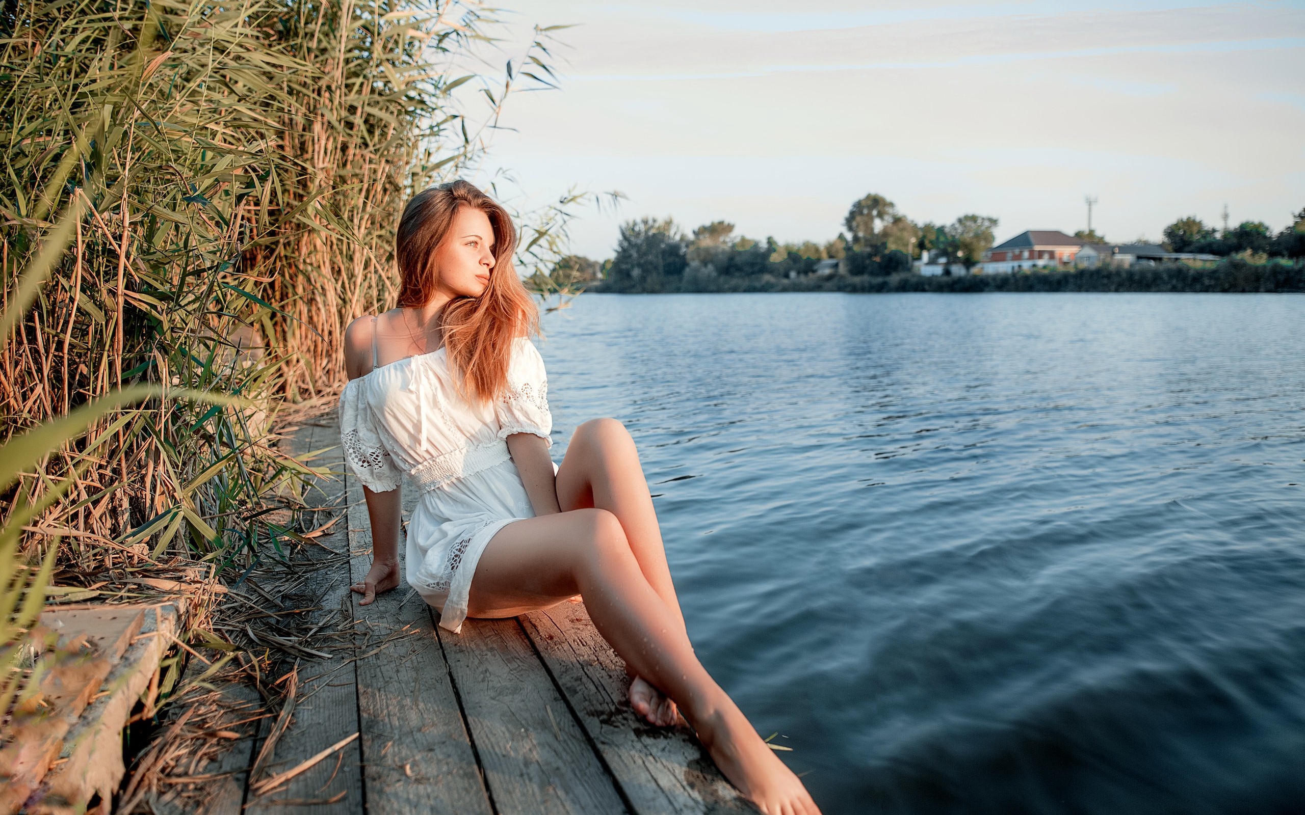 Description: A woman sitting on a dock next to a body of water with reeds in the background and a house in the background.