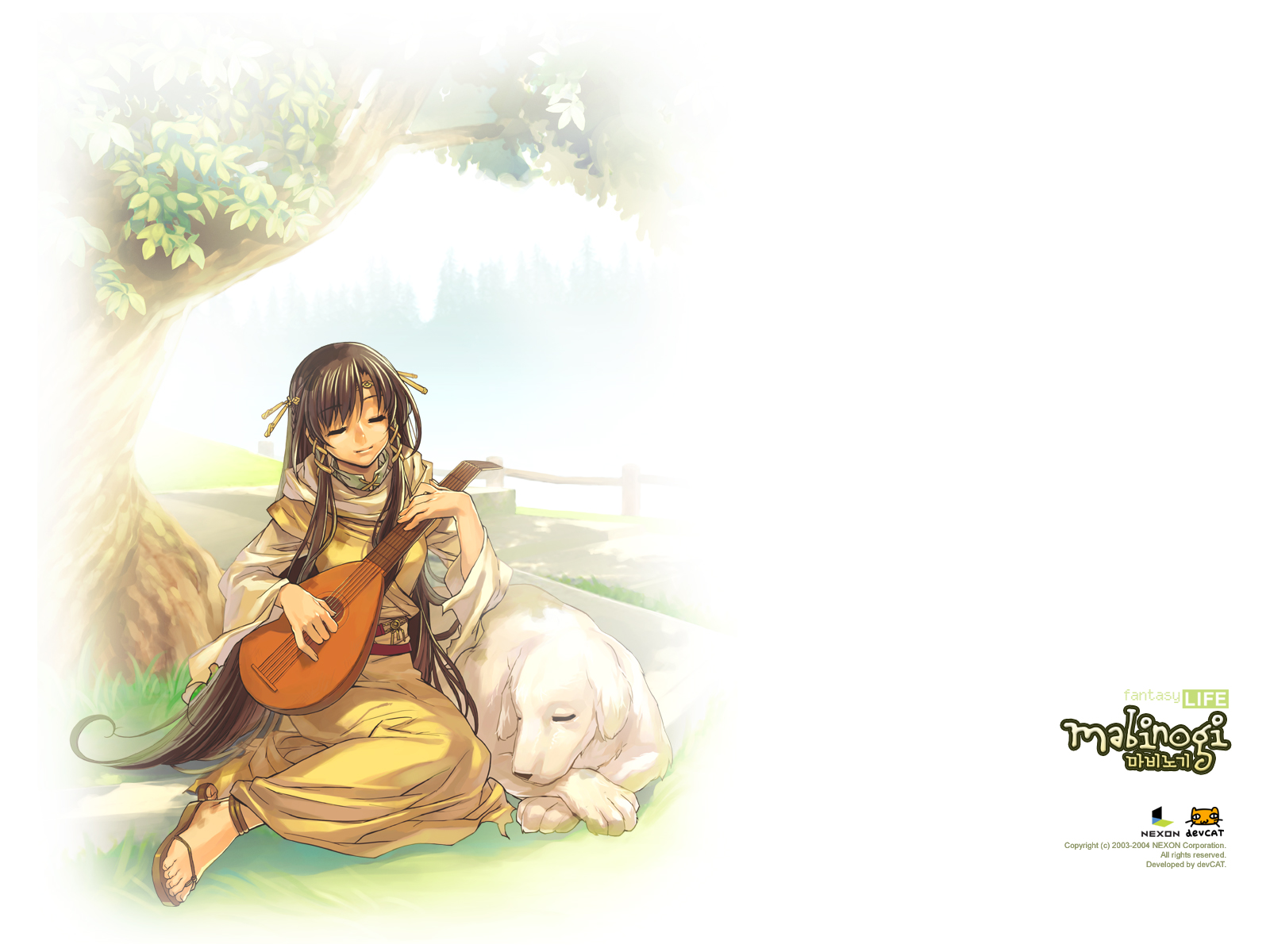Description: A woman sitting next to a white dog on a field with a tree in the background and a white background.