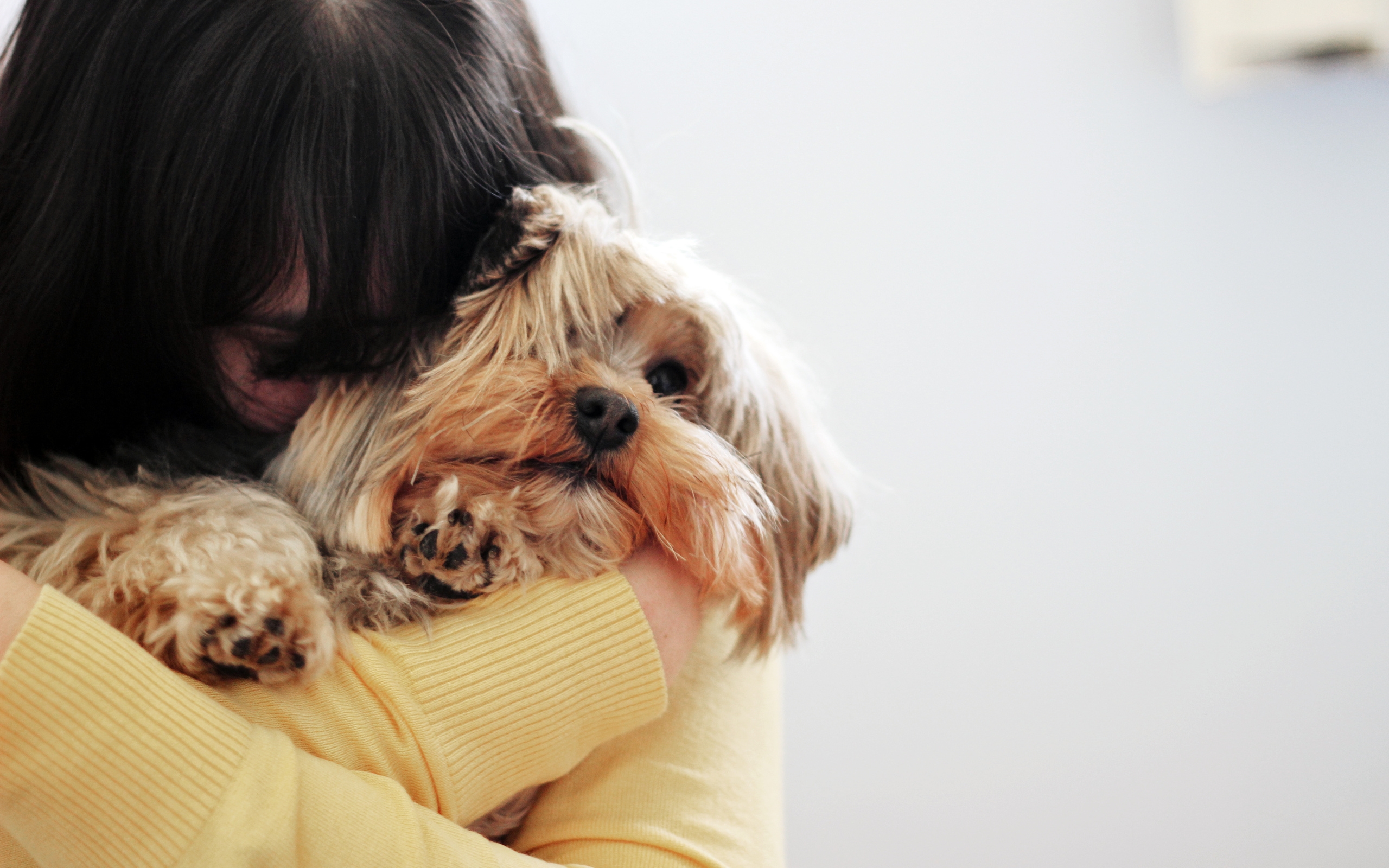 Description: A woman holding a dog in her arms while wearing a yellow sweater and a yellow sweater on her head.