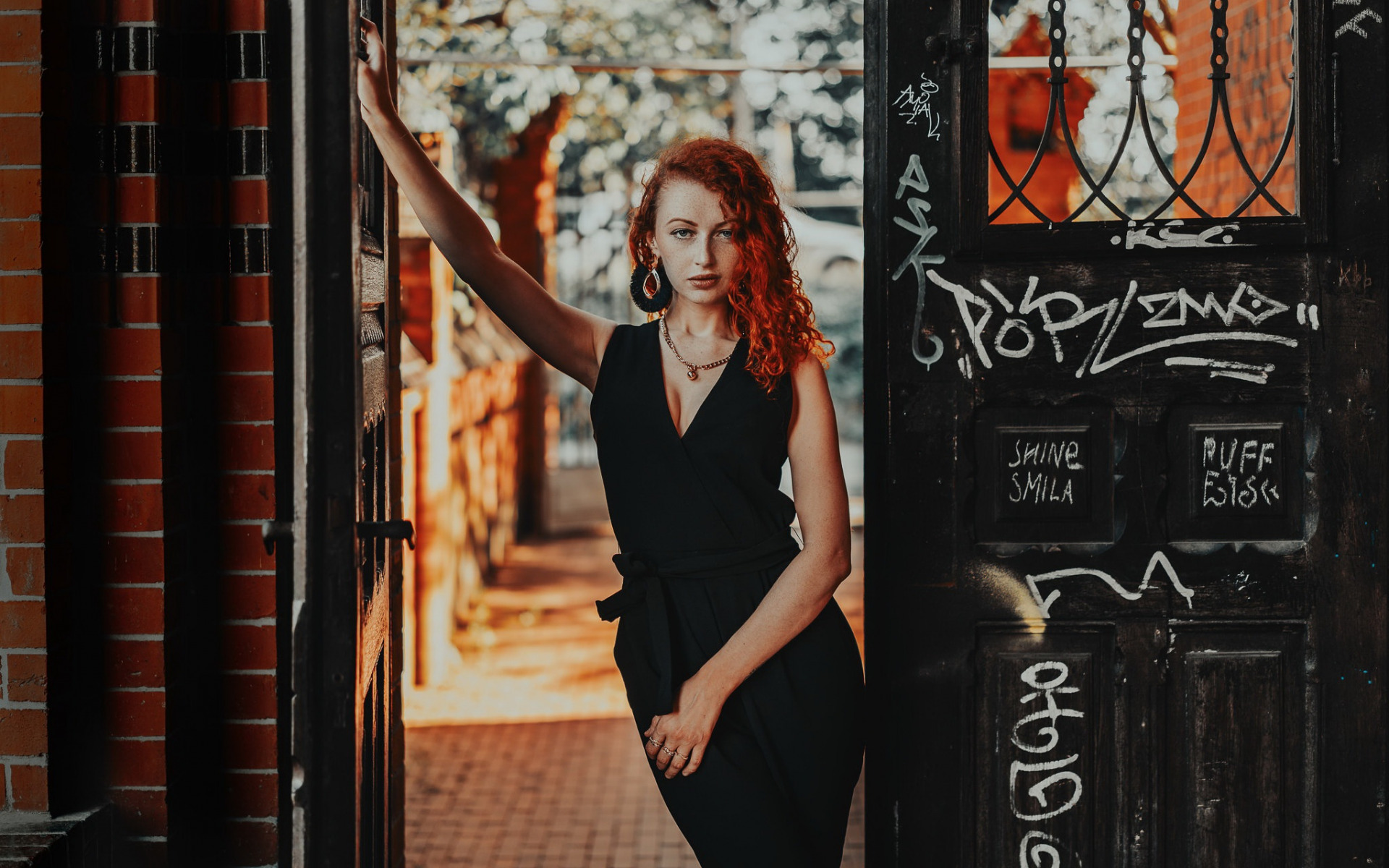 Description: A woman standing in a doorway with her hand on the door handle of a building with graffiti on it.