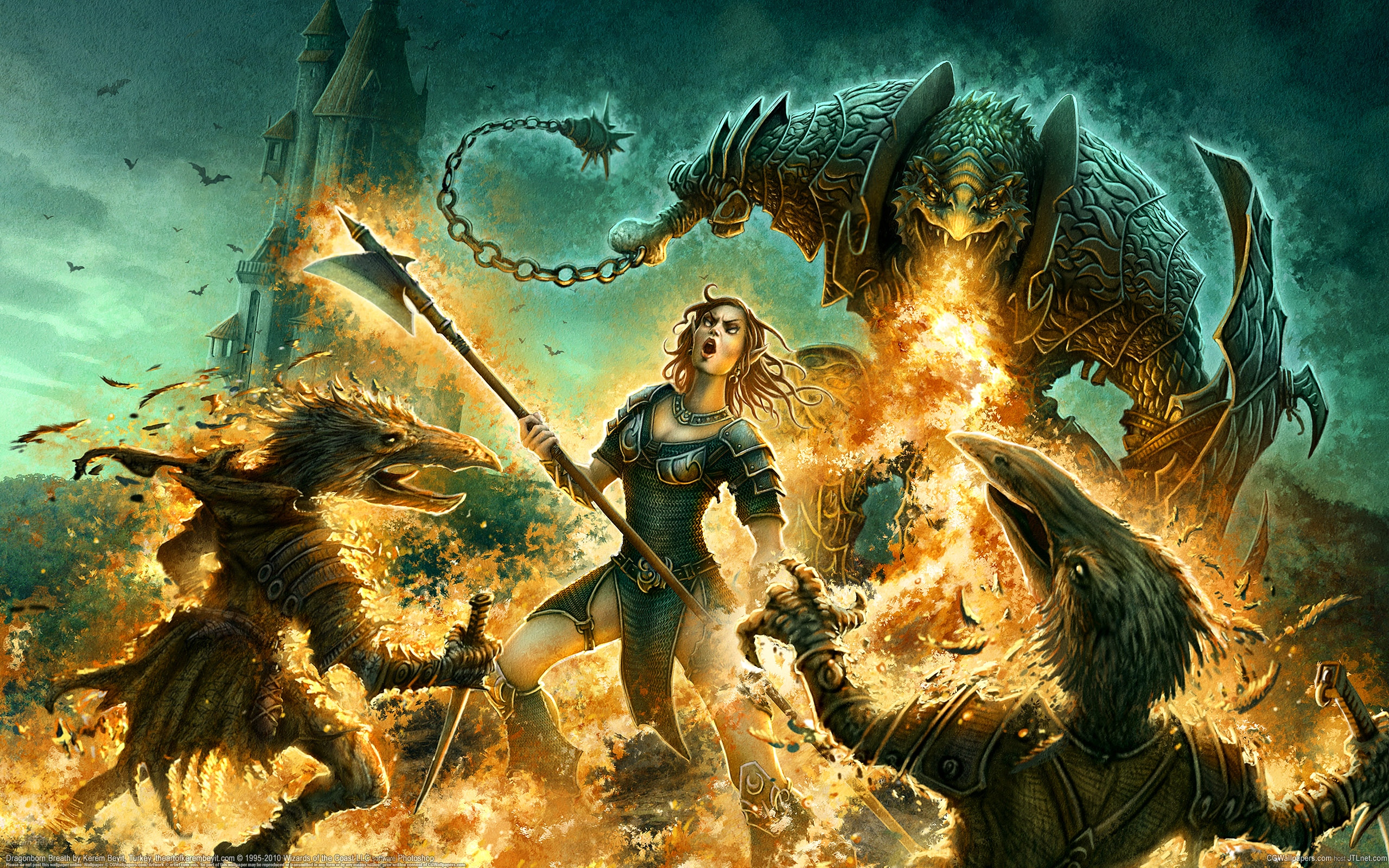 Description: A woman holding a sword standing next to a dragon and a demon on fire with a sword in her hand.