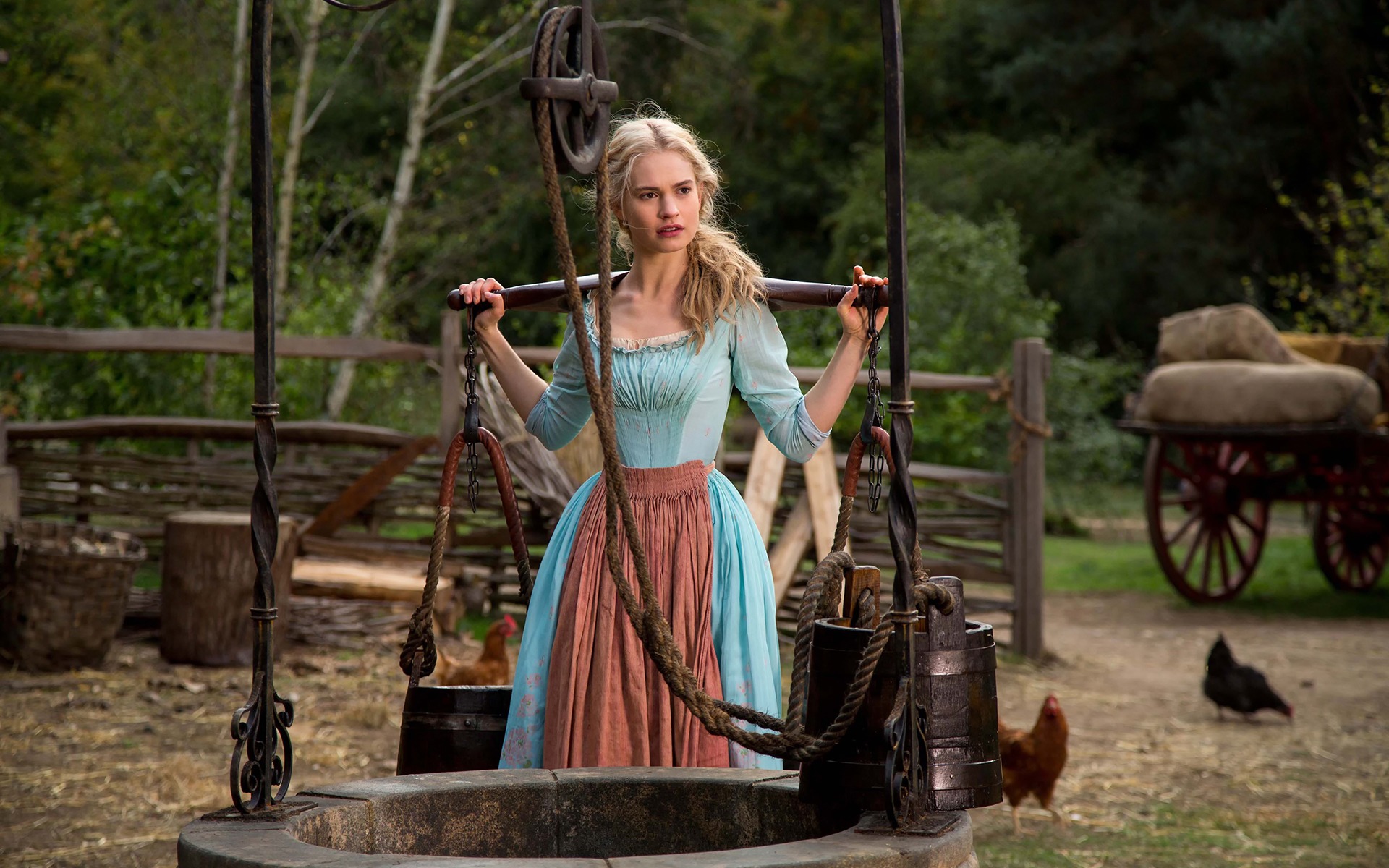 Description: A woman in a dress is holding a pole and a bucket with a bird on it and a chicken on the ground.