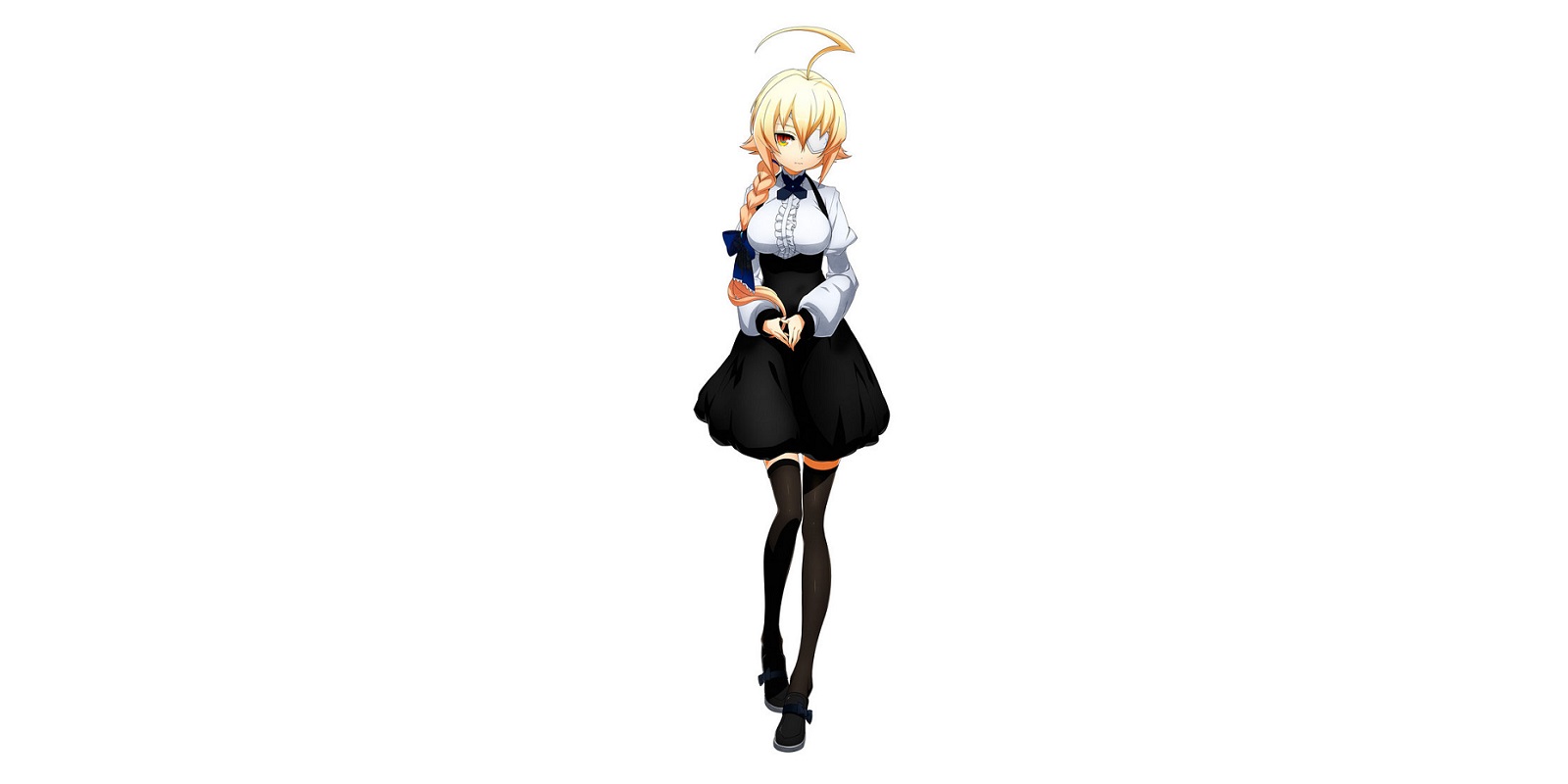 Description: A woman in a short dress and black stockings is standing with her hands on her hips and her hair up.