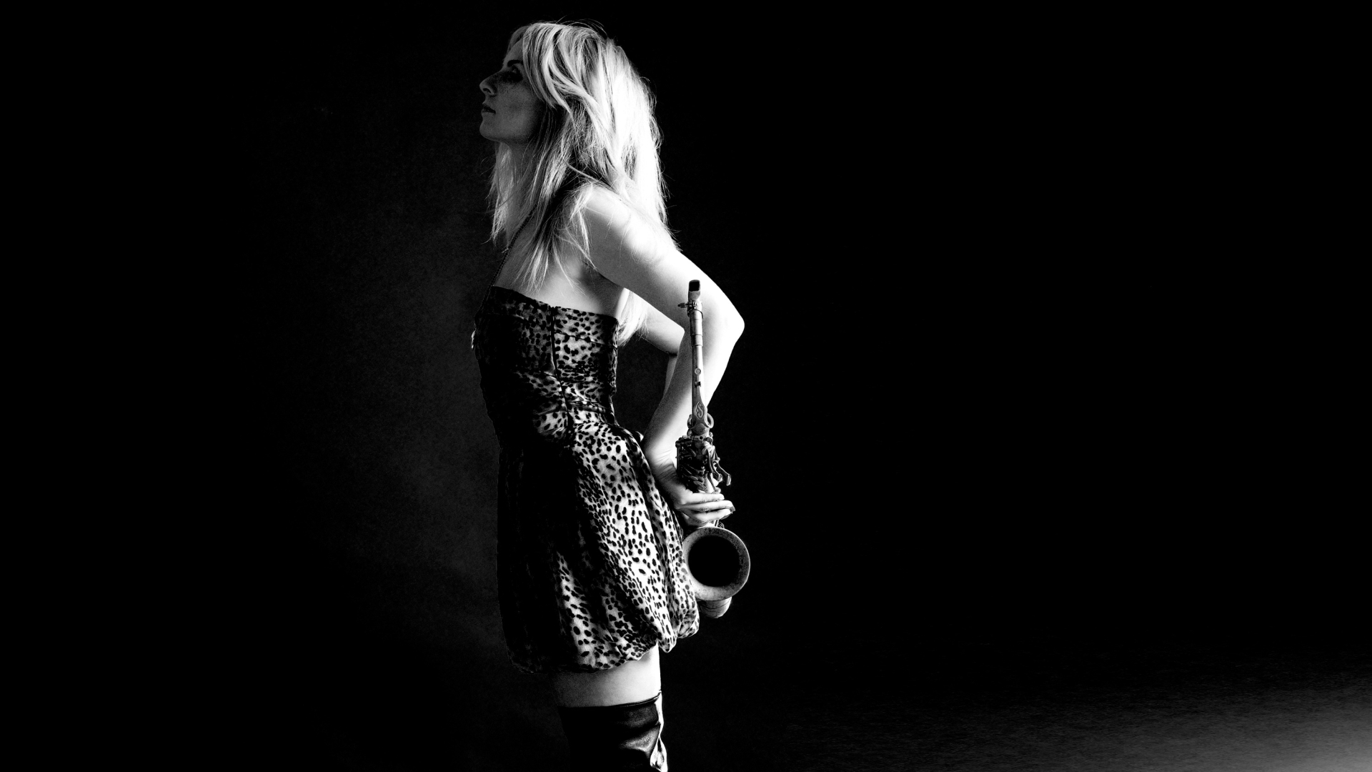 Description: A woman in a dress and boots is holding a hat and a bag in her hand and standing in the dark.