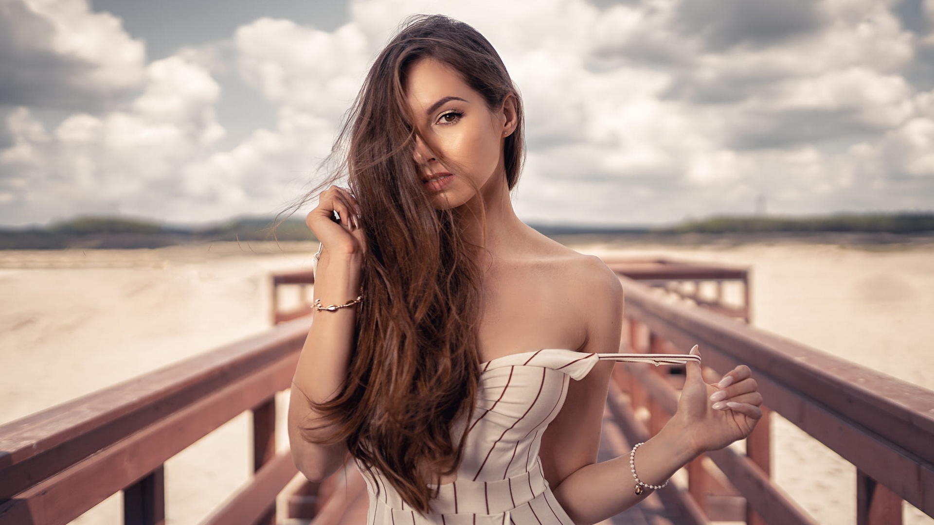 Description: A woman in a dress is standing on a bridge and posing for a picture with her hair in the wind.
