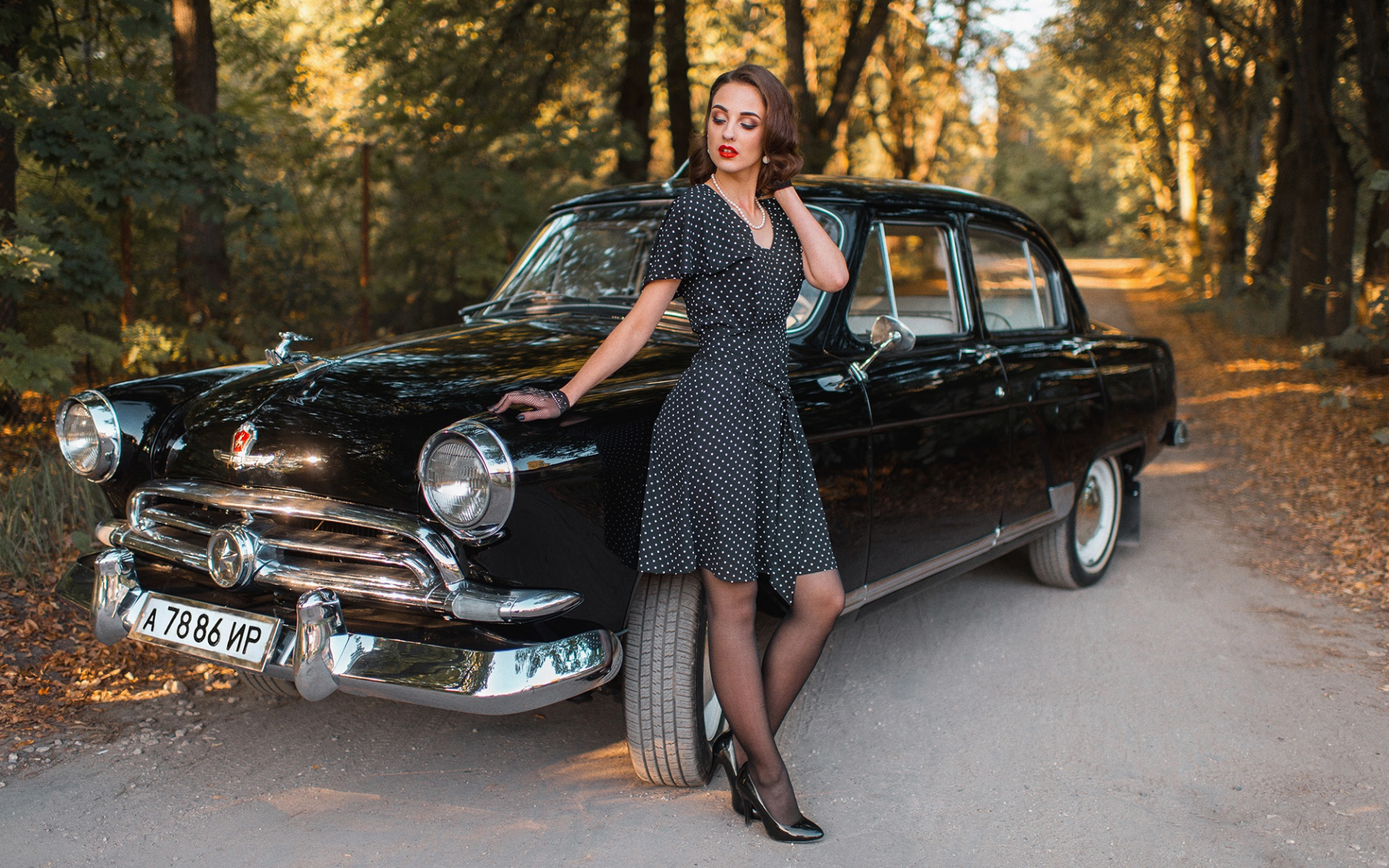 Description: A woman in a dress leaning on a car in the woods with a cigarette in her mouth and a cigarette in her mouth.
