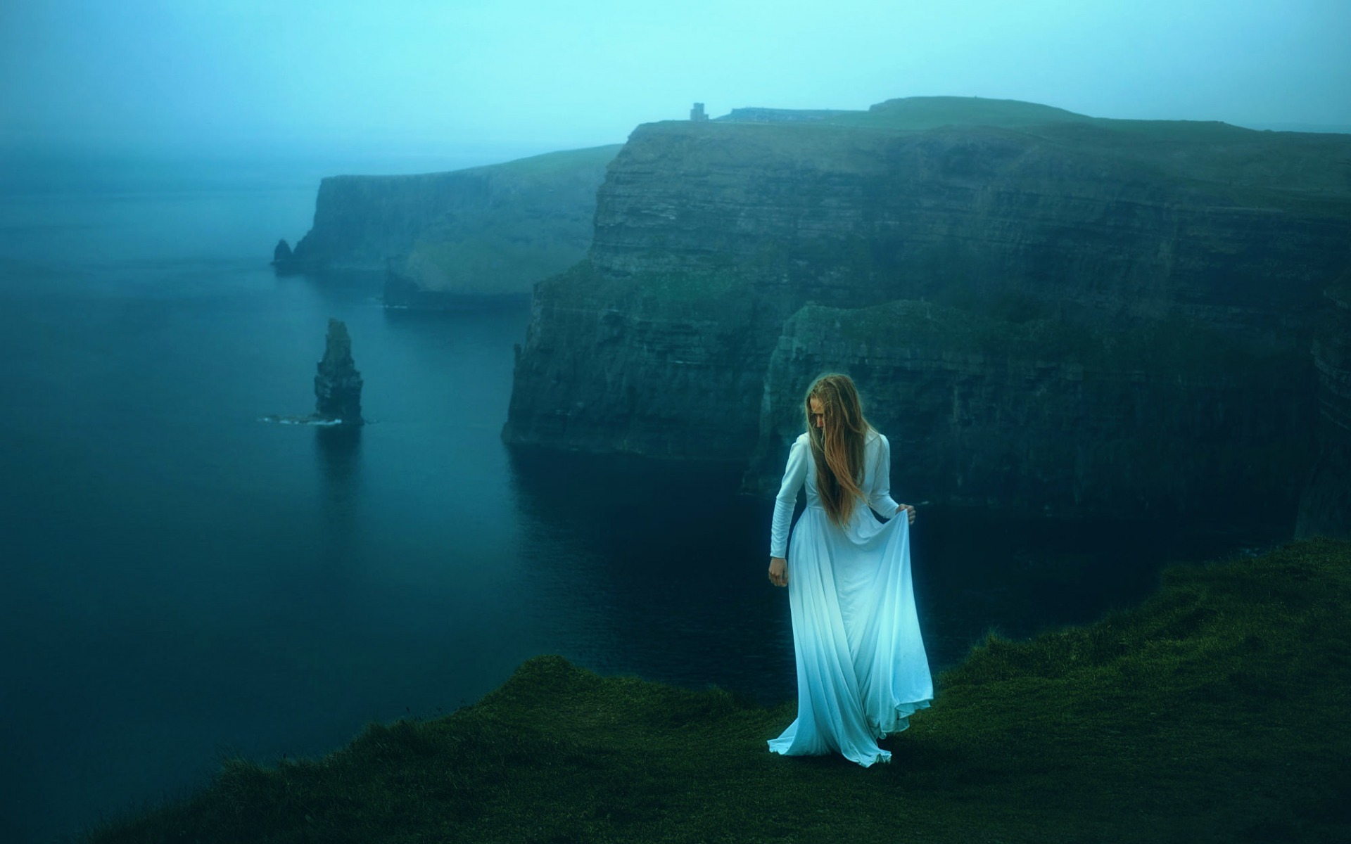 Description: A woman in a white dress standing on a cliff overlooking the ocean and cliffs in the distance with a boat in the water.