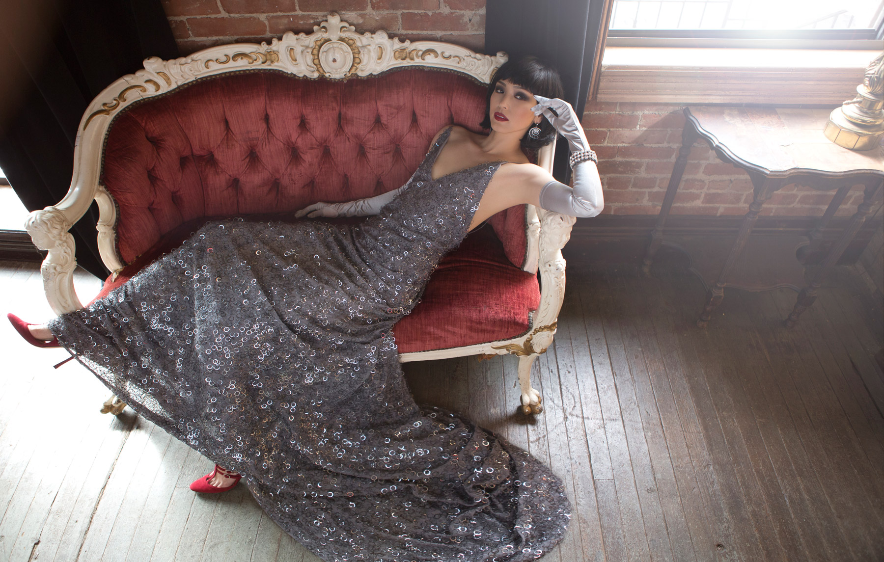 Description: A woman in a dress sitting on a couch with a red chair in front of her and a brick wall behind her.