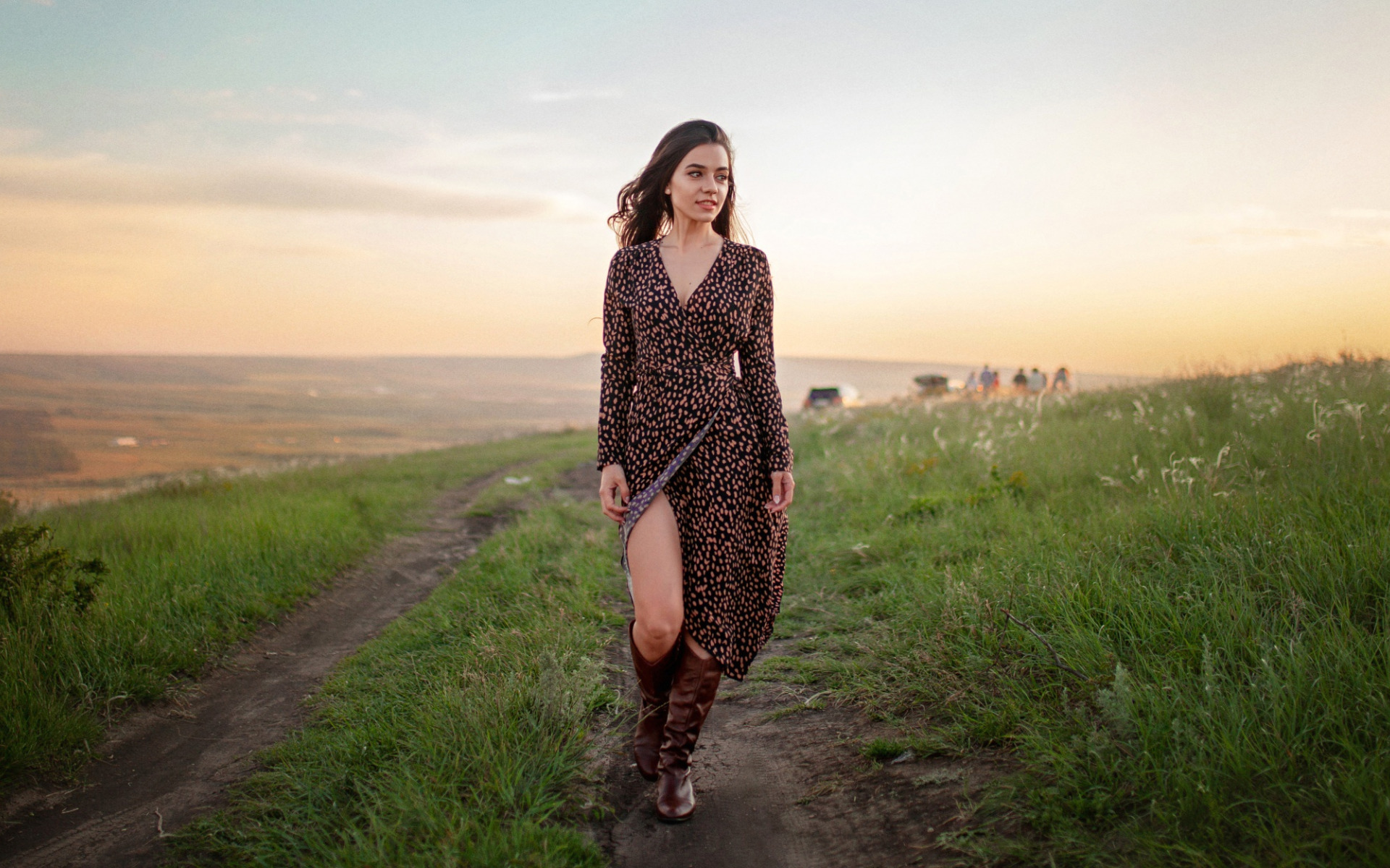 Description: A woman in a dress walking down a dirt road with a dog on a leash in her hand and a dog in her other hand.