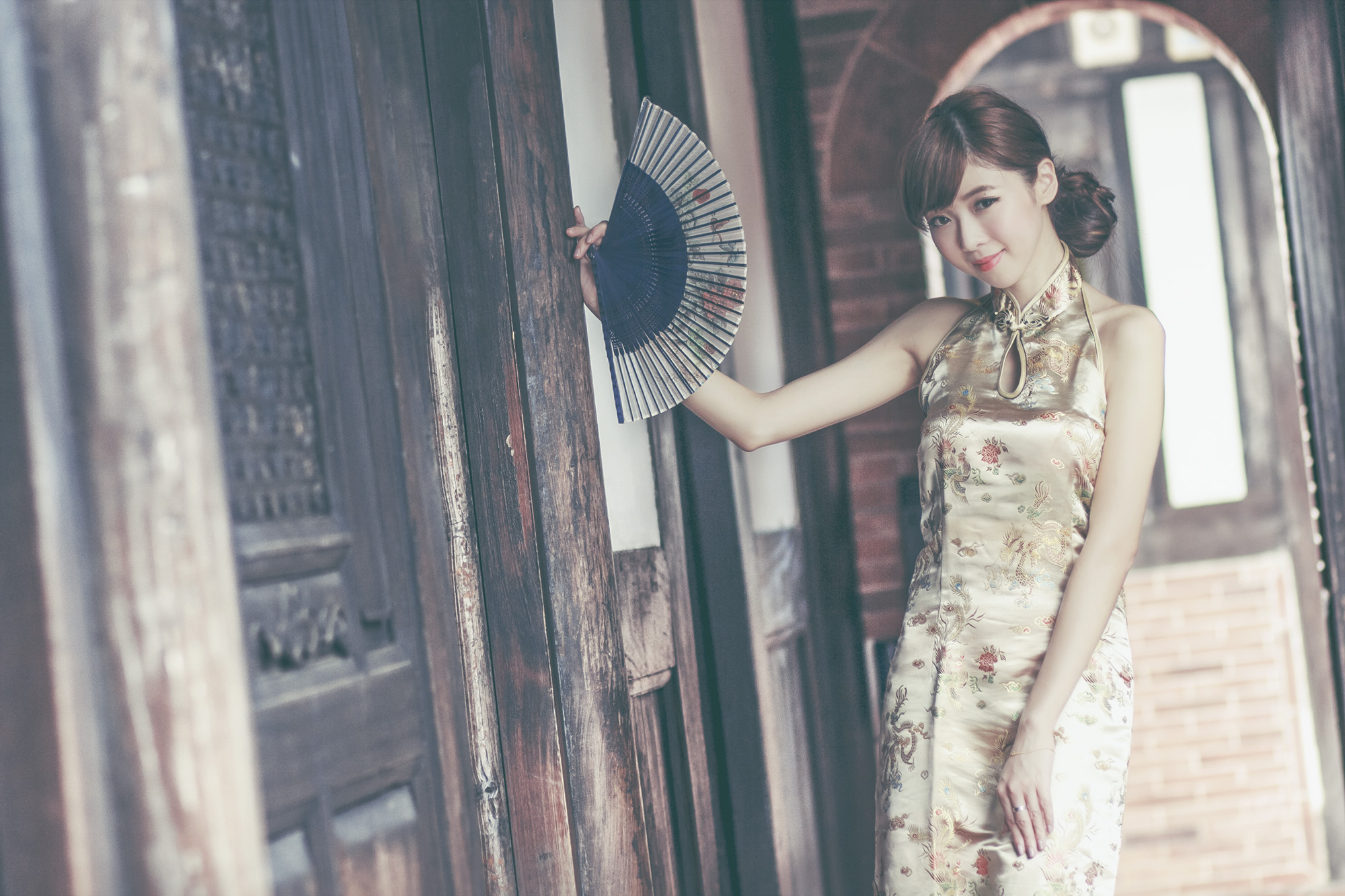 Description: A woman in a dress holding a fan in her hand and smiling at the camera while standing in a doorway.