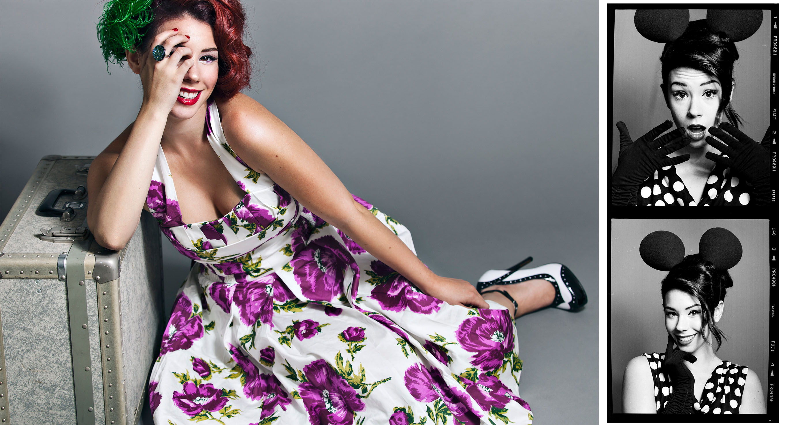 Description: A woman in a dress with a green hair and a mickey mouse hat on her head and a suitcase.