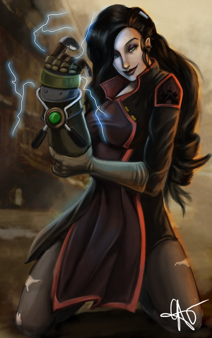 Description: A woman in a dress holding a gun and a lightening bolt in her hand.