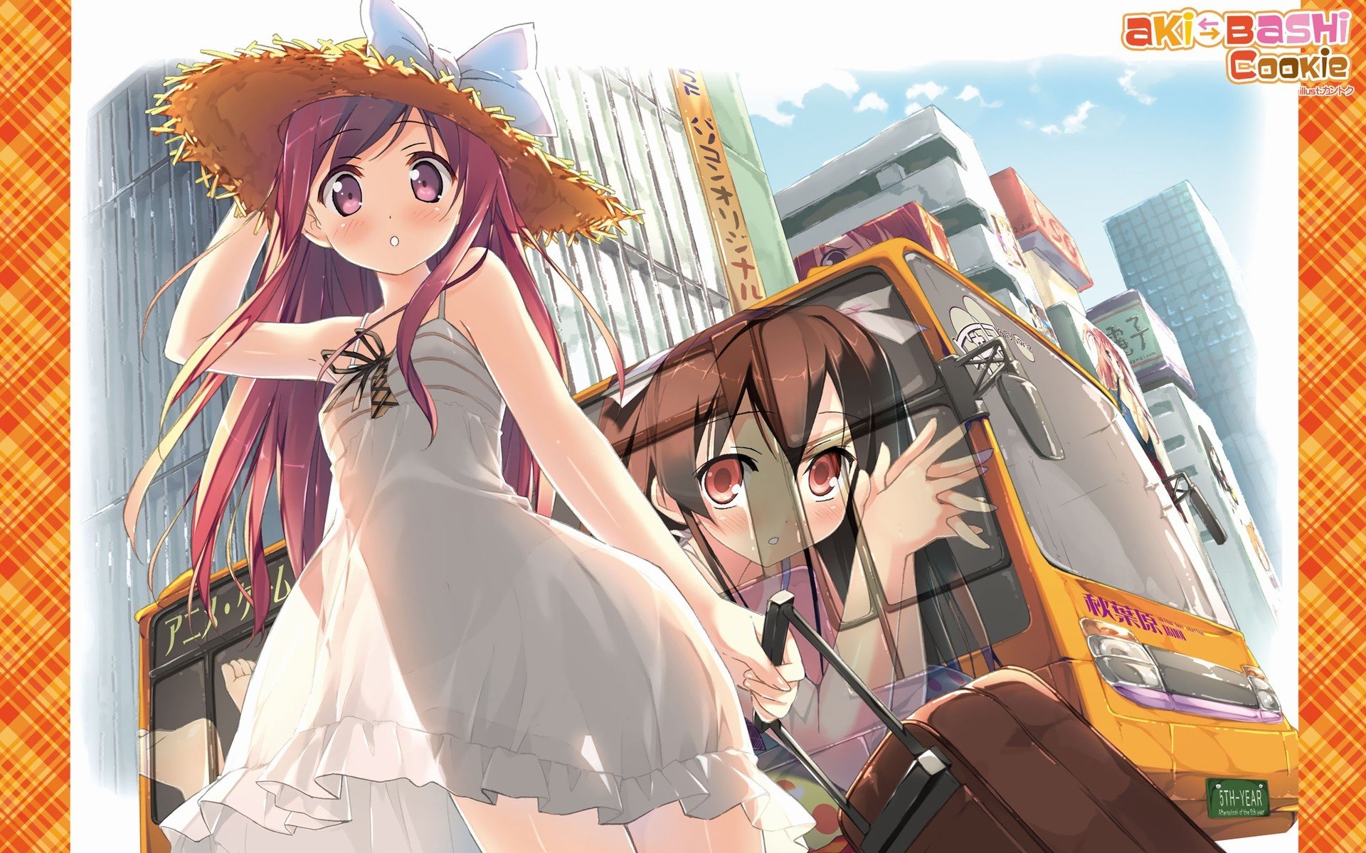 Description: A woman in a dress and hat standing next to a bus with a man in a suit case behind her.