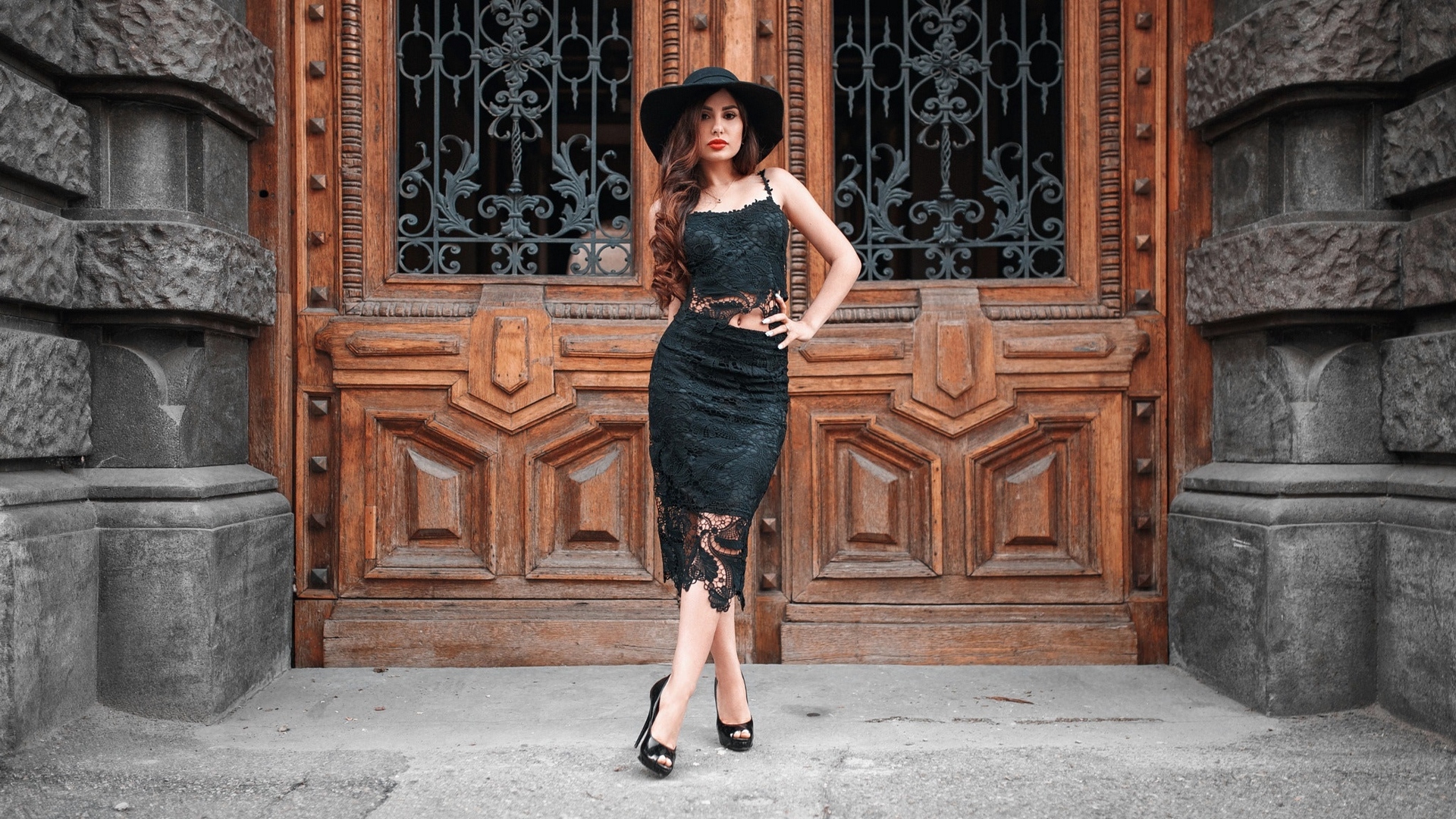 Description: A woman in a black dress and hat standing in front of a door with a wooden door frame and iron grill.