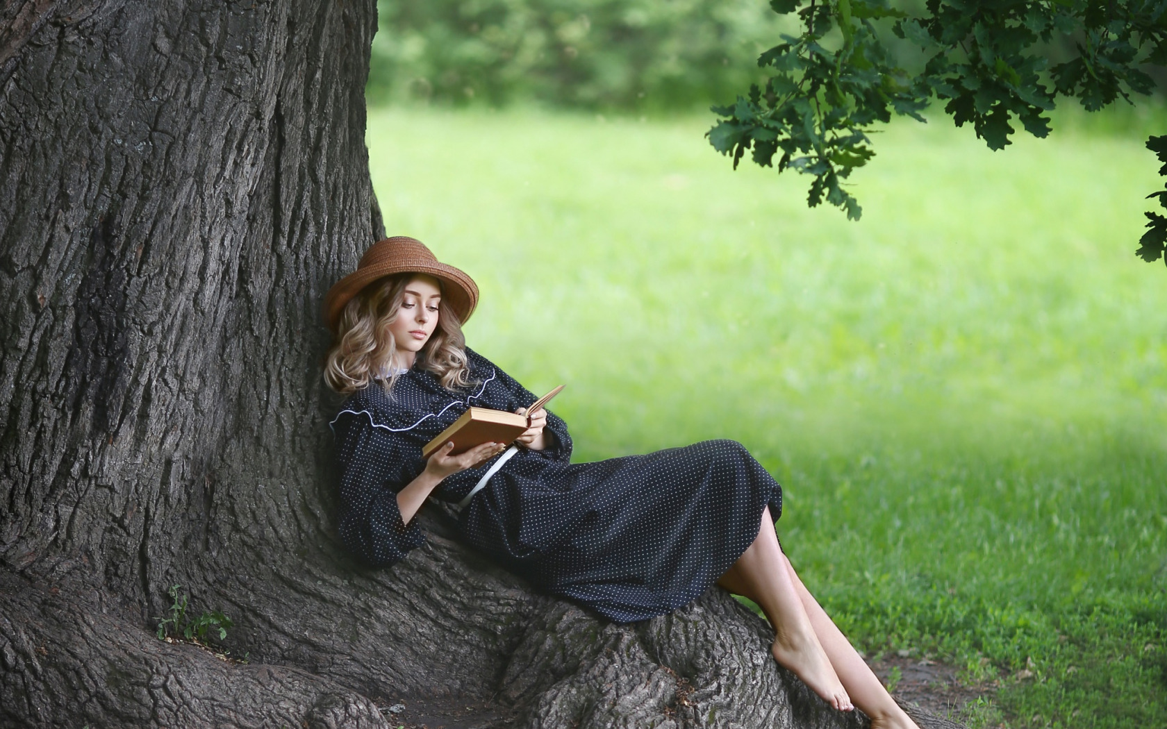 Description: A woman in a dress and hat sitting on a tree reading a book while wearing a hat and reading a book.