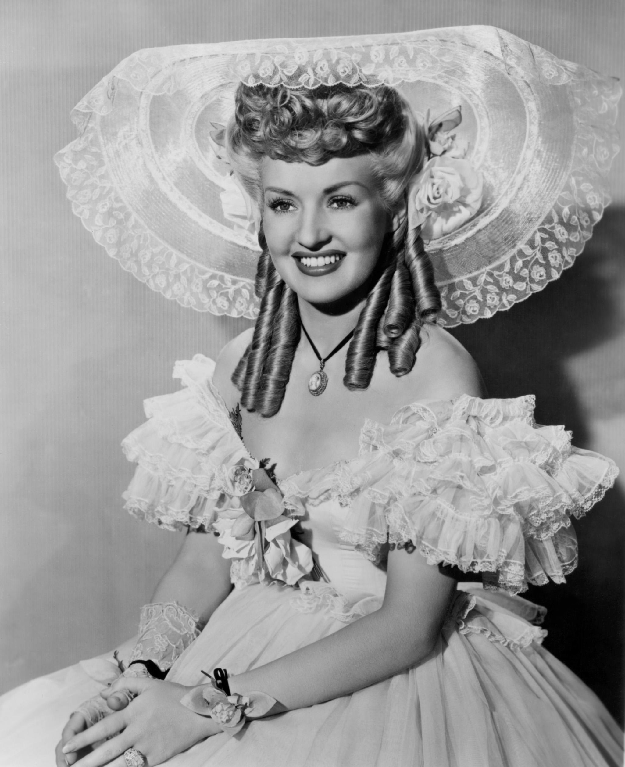 Description: A woman in a dress and hat with a large umbrella over her head and hands on her chest.