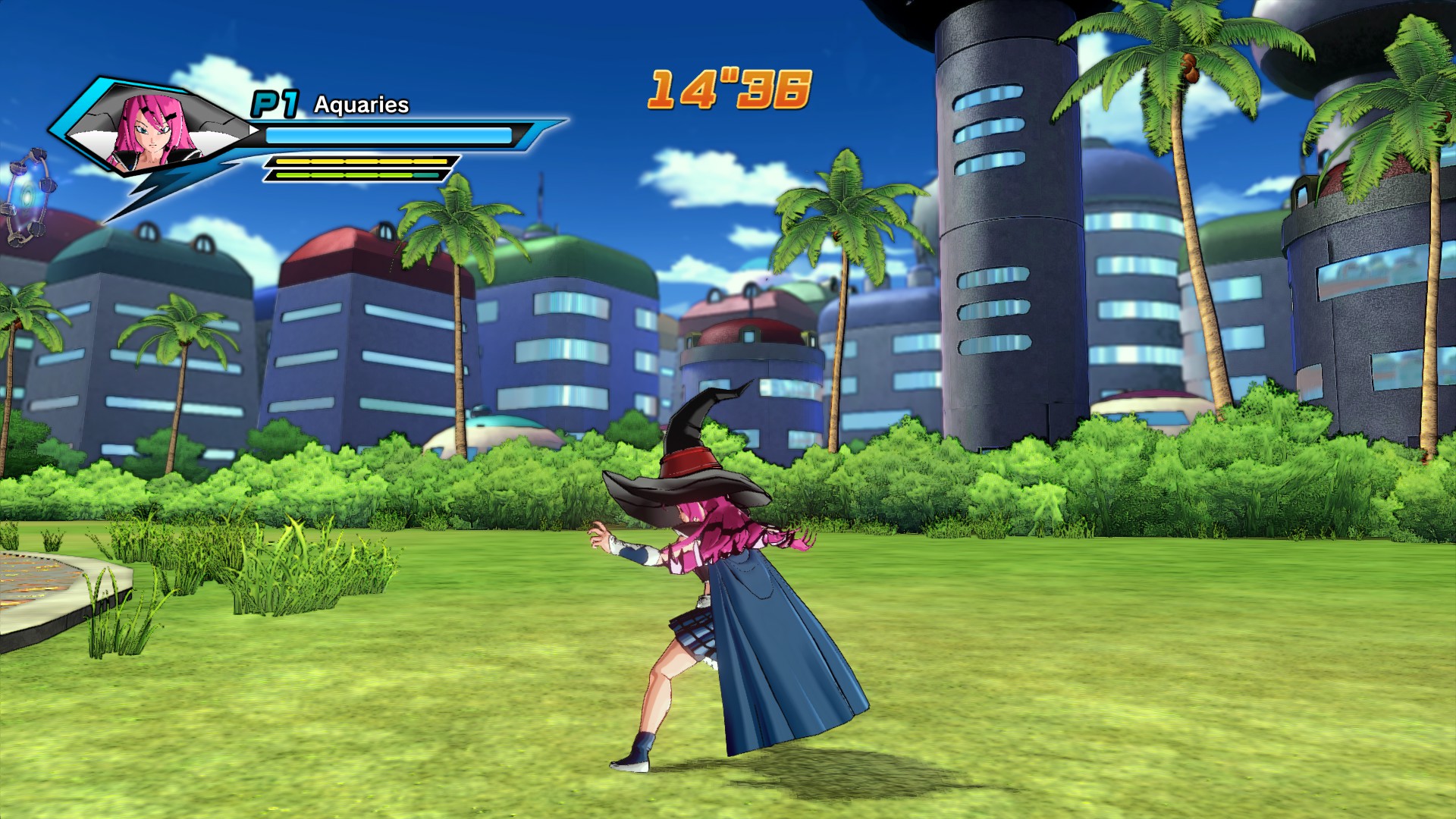Description: A woman in a dress and hat playing a game of wii tennis on a lawn with palm trees in the background.