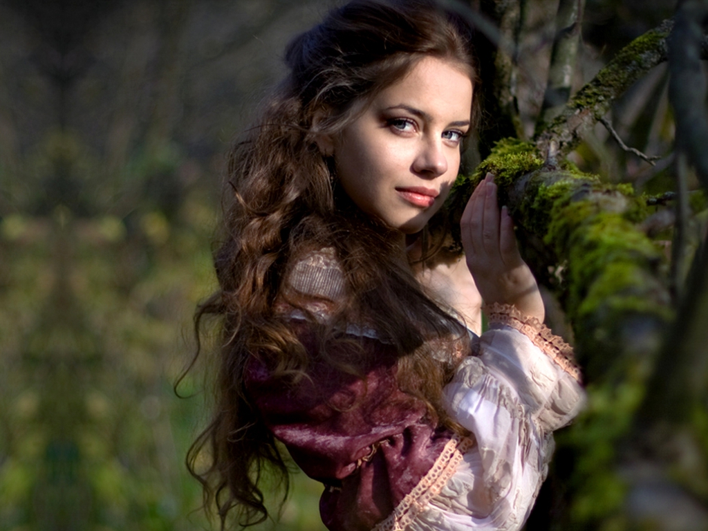 Description: A woman in a dress is holding a tree branch in a forest with moss growing on it's sides.