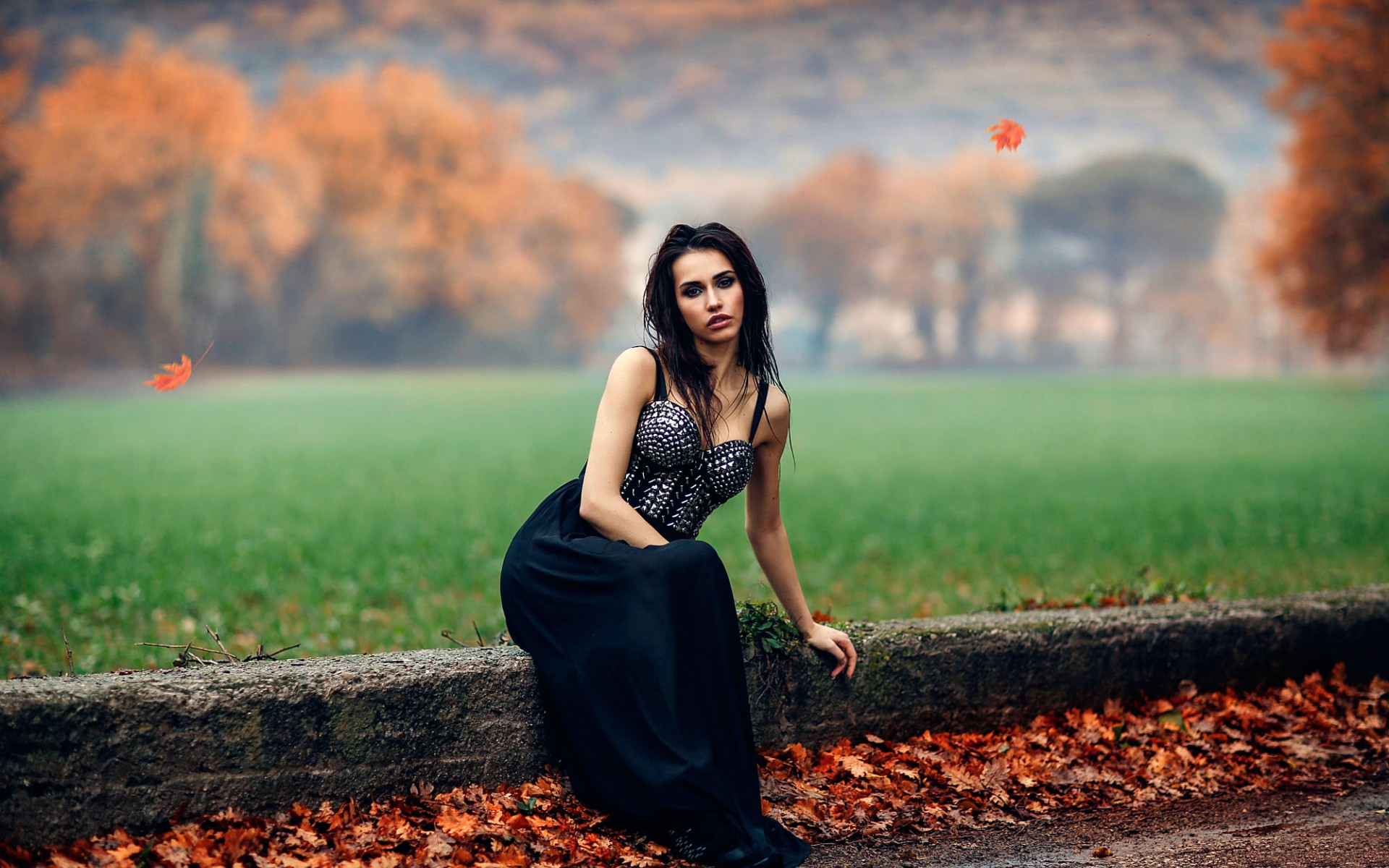 Description: A woman in a long dress leaning on a wall in a field of leaves with a tree in the background.