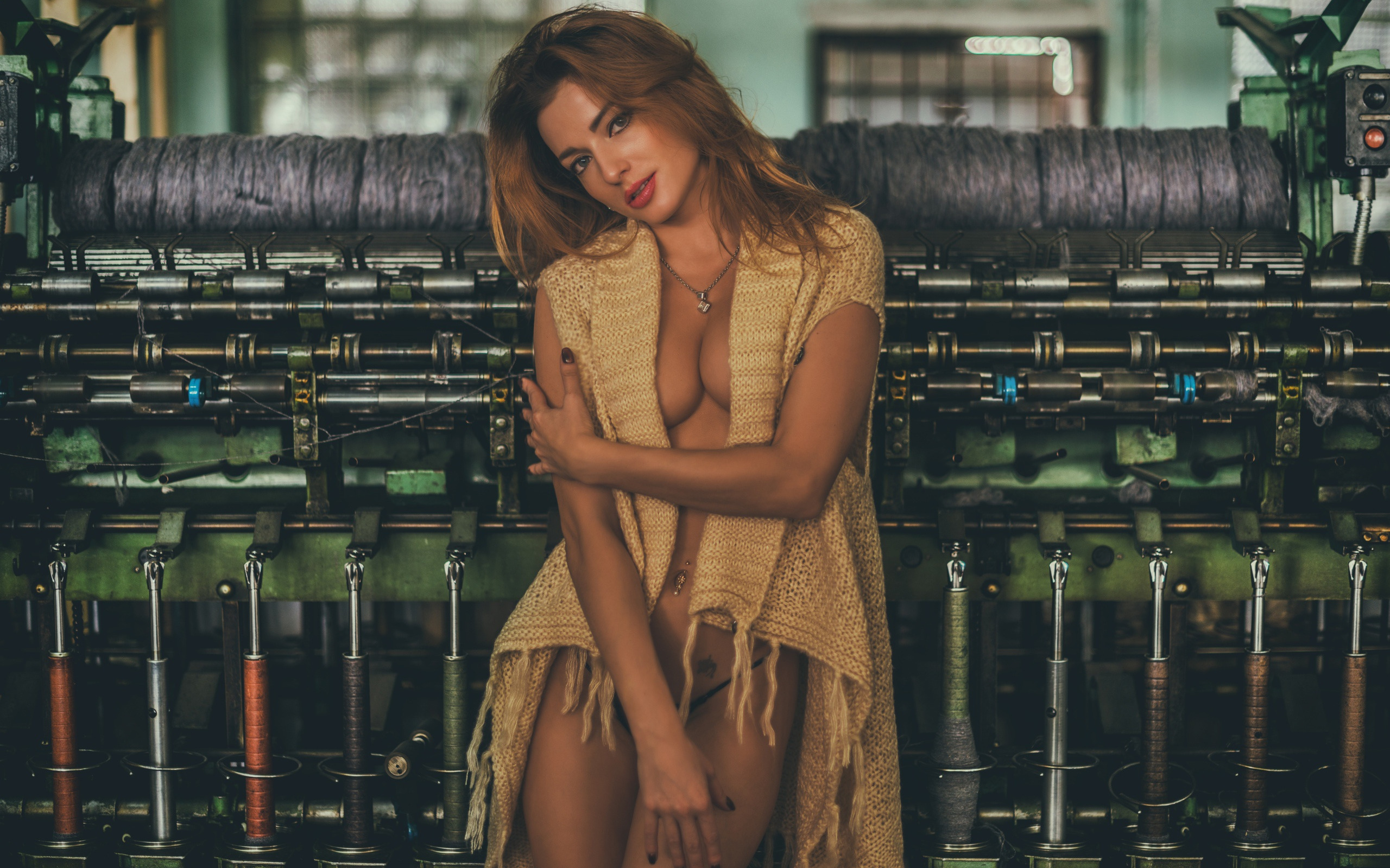 Description: A woman in a dress standing in front of a machine room with lots of pipes and wires in it.