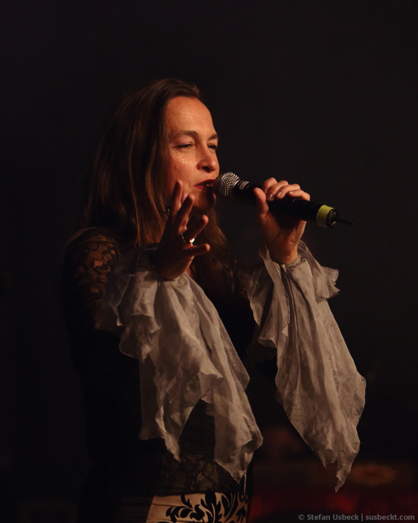 Description: A woman in a dress holding a microphone in her hands and singing into a microphone with a black background.