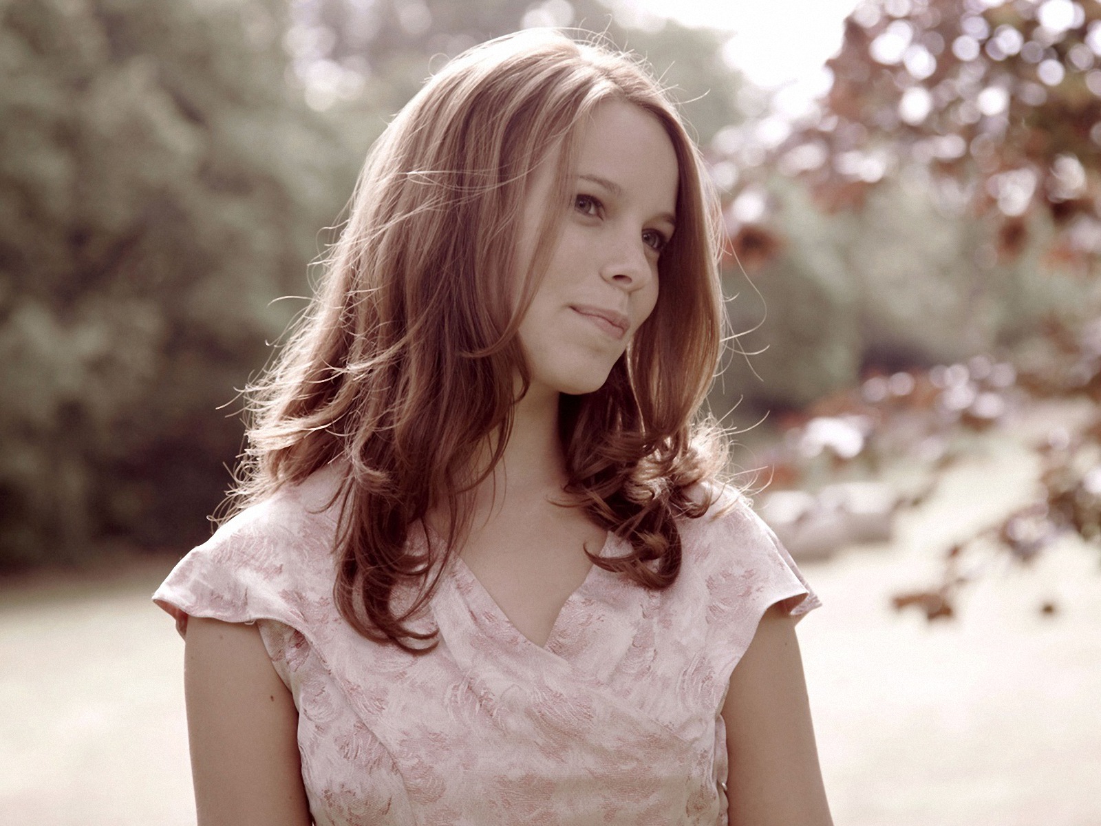 Description: A woman in a dress standing in a park with trees in the background and a frisbee in her hand.