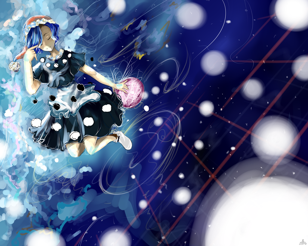 Description: A woman in a dress is holding a pink ball in the snow with snow flakes on the ground.