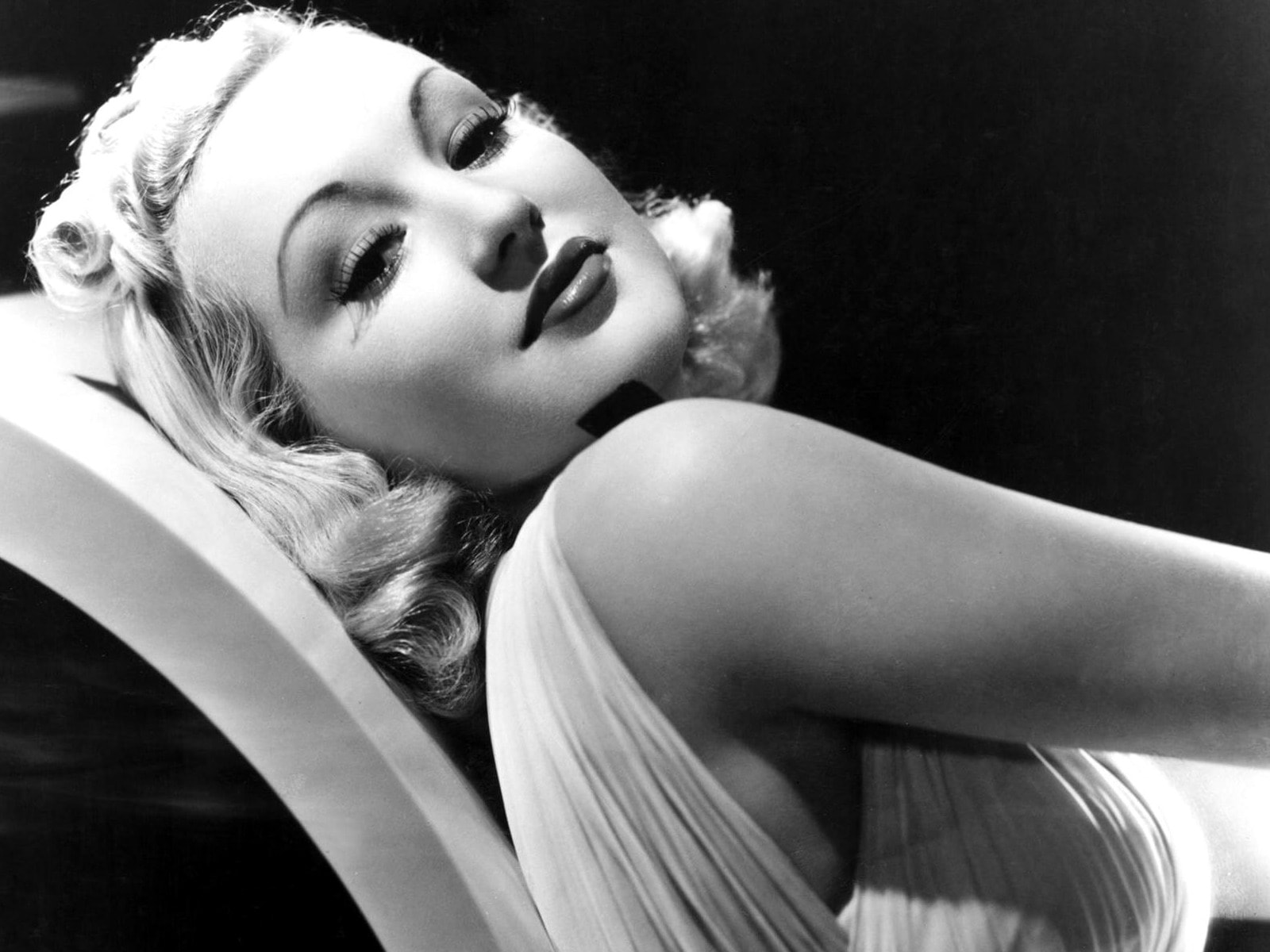 Description: A woman in a dress is posing for a picture in a chair with her hand on her chin and her eyes closed.