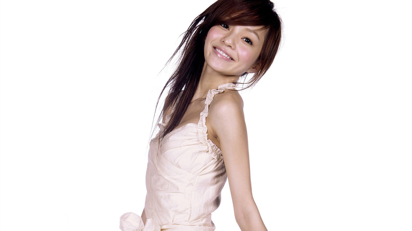 Description: A woman in a dress posing for a picture with her hair in the wind and a smile on her face.