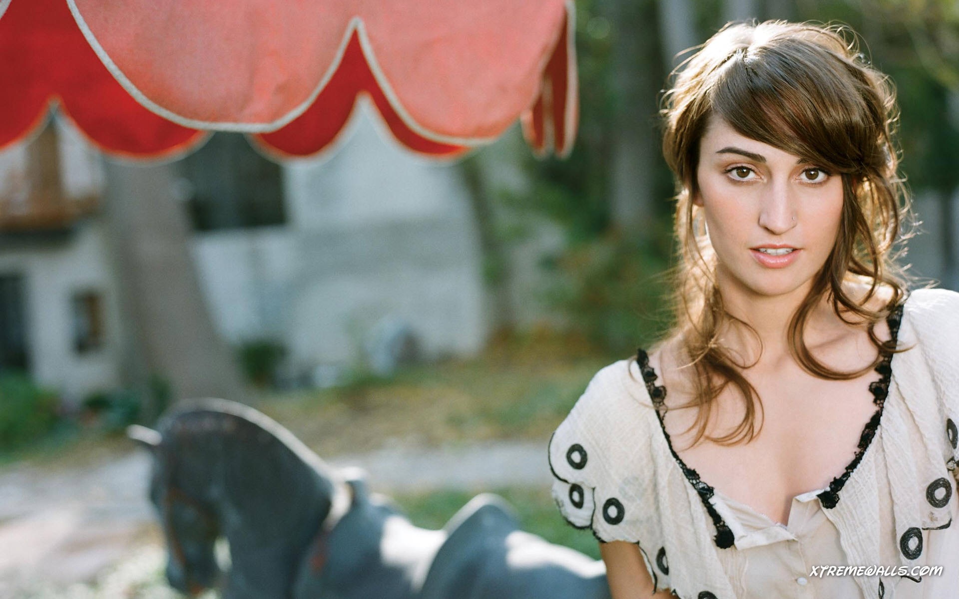 Description: A woman in a dress is posing for a picture in front of a red umbrella and a building with a red roof.