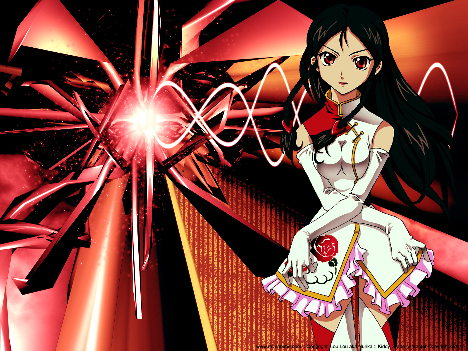 Description: A woman in a white dress holding a red object in her hand and a red light shining behind her.