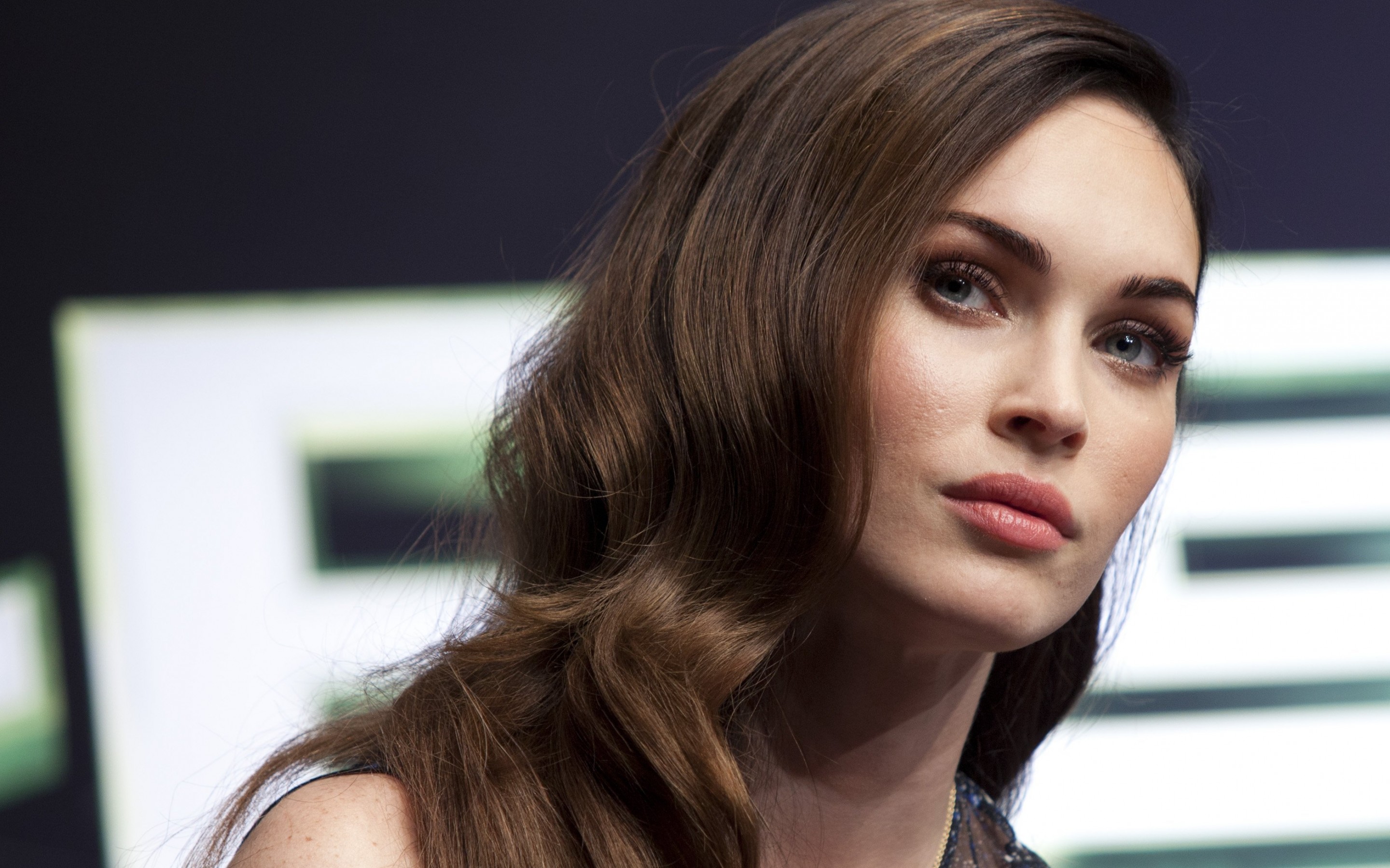 Description: A woman with long hair and a dress on a stage with a microphone in front of her and a wall behind her.