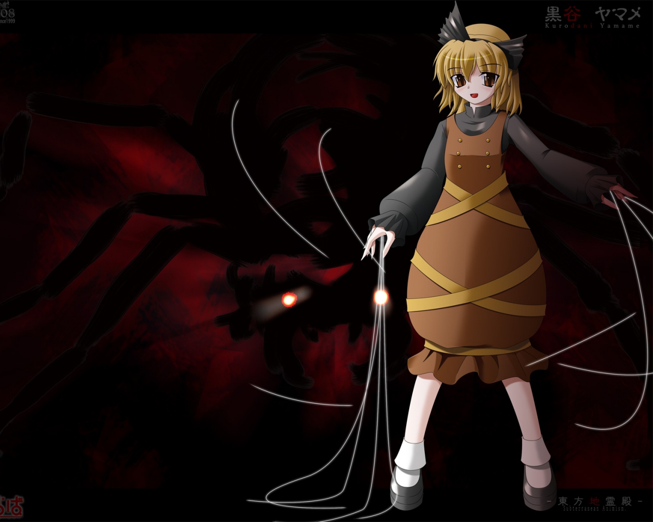 Description: A woman in a dress holding a string in her hand and a demon in the background with a red light.
