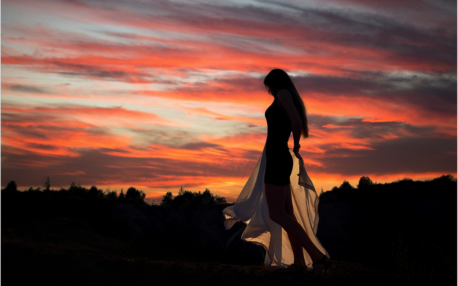 Description: A woman in a long dress is walking in the sunset with her long hair blowing in the wind and a red sky behind her.