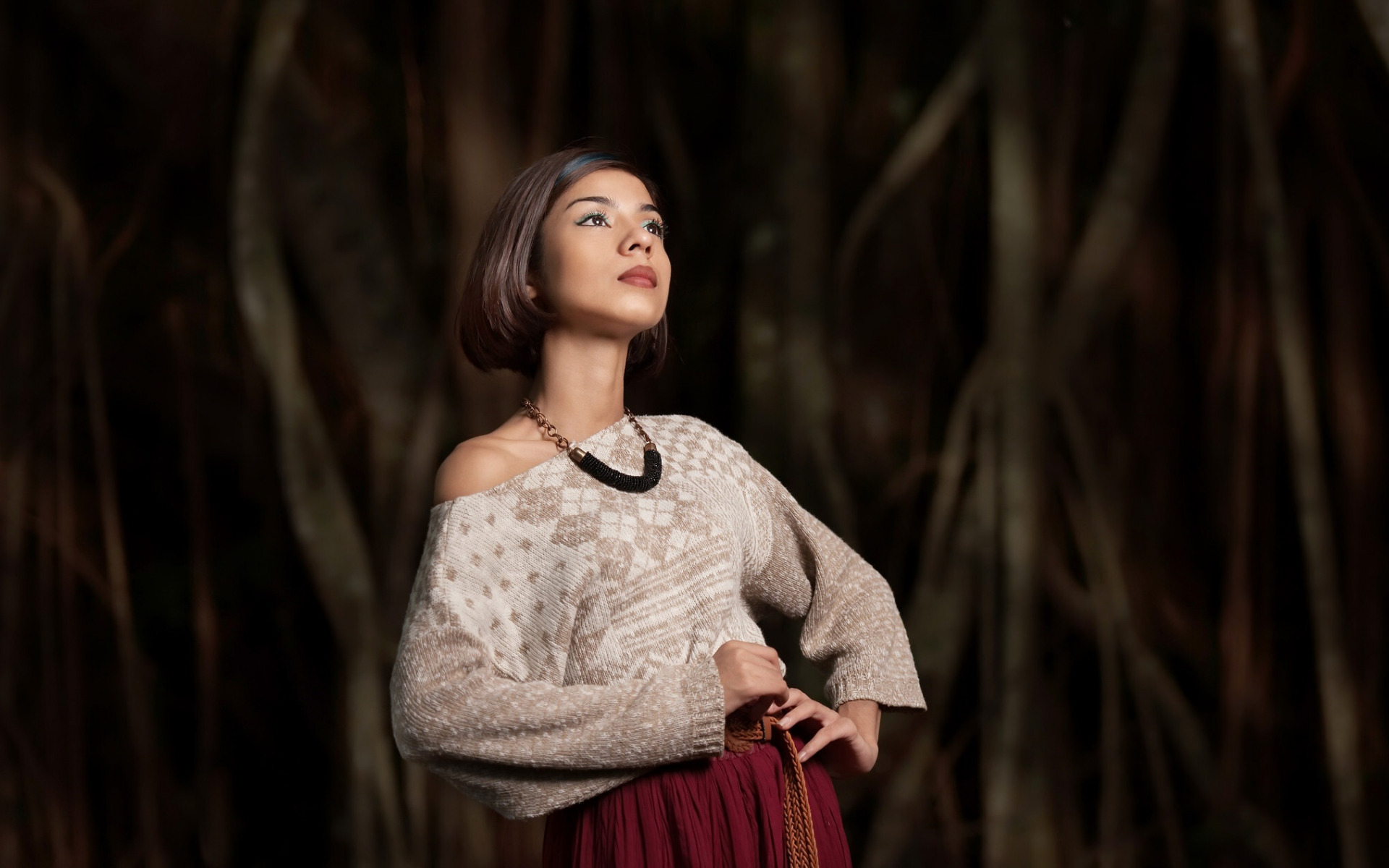 Description: A woman in a dress standing in front of a tree with her hands on her hips and looking up.