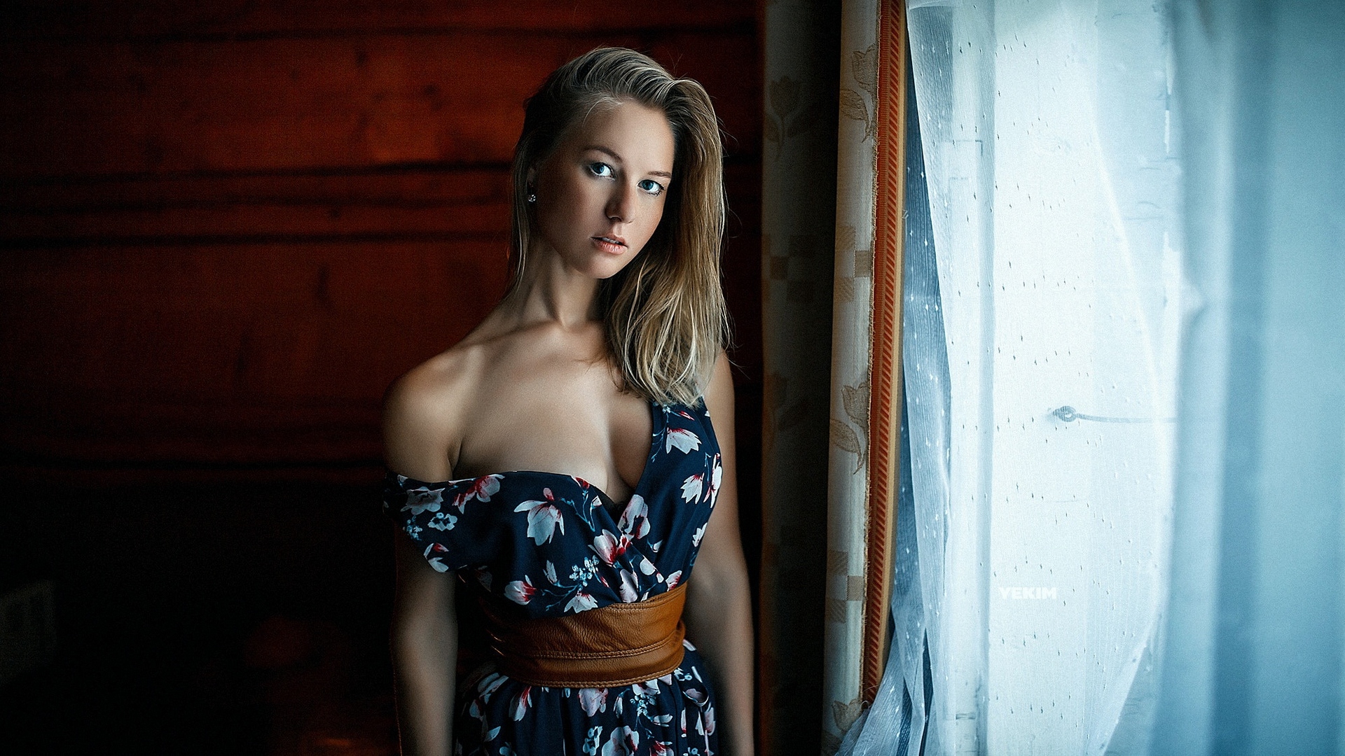 Description: A woman in a dress standing next to a window with a curtain open and looking at the camera with a serious look on her face.