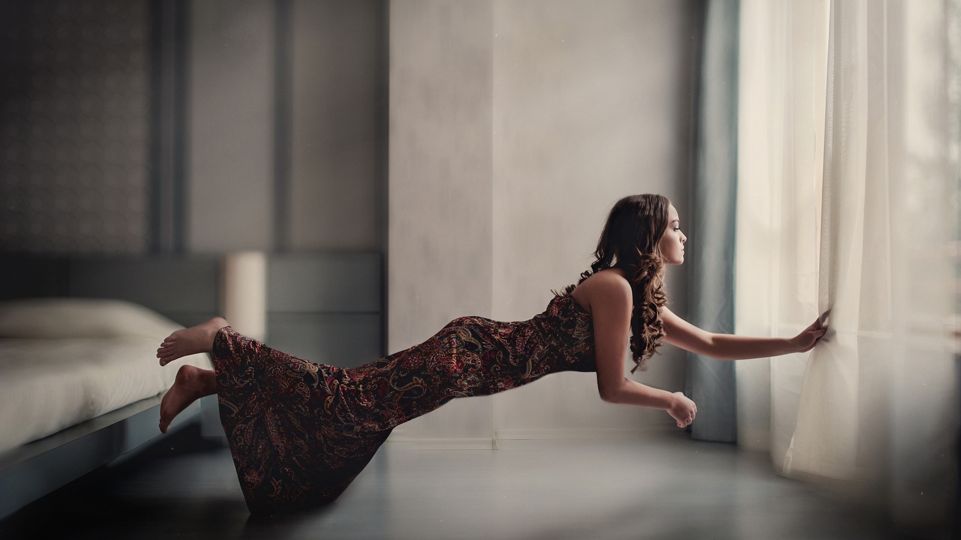 Description: A woman in a dress leaning against a window sill and looking out the window at the outside of the room.