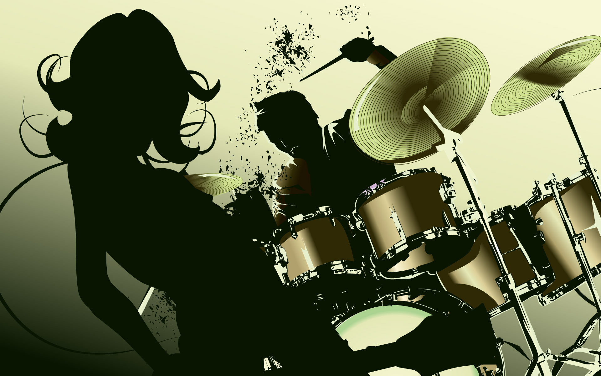 Description: A woman playing drums in front of a drum set with a man in the background with a microphone in his hand.
