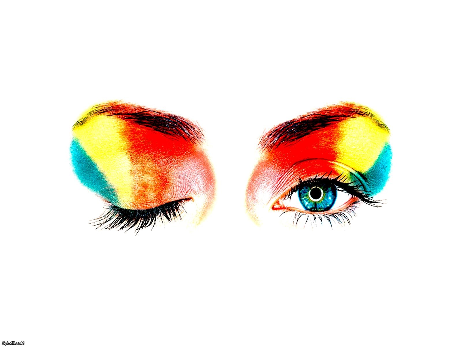 Description: A woman's eye with a rainbow colored makeup and eyelashes on it's face.