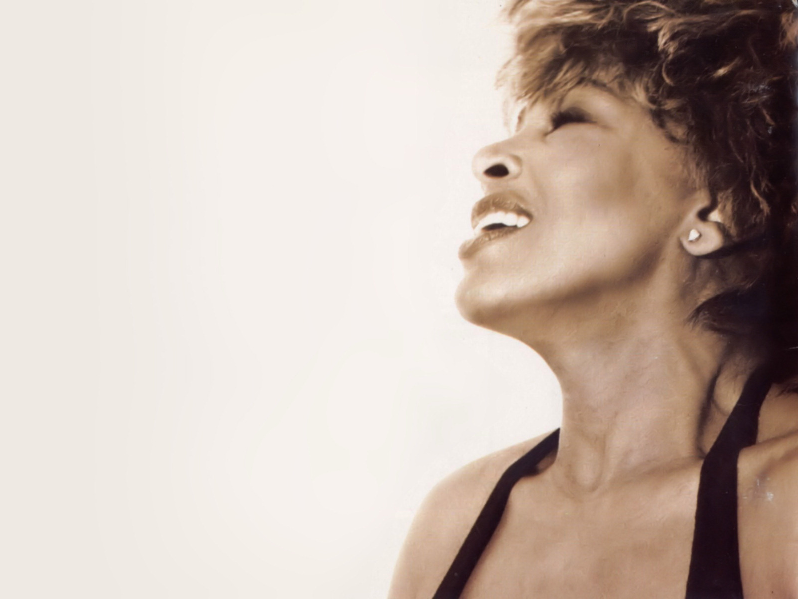Description: A woman with her eyes closed and her hair in the air.