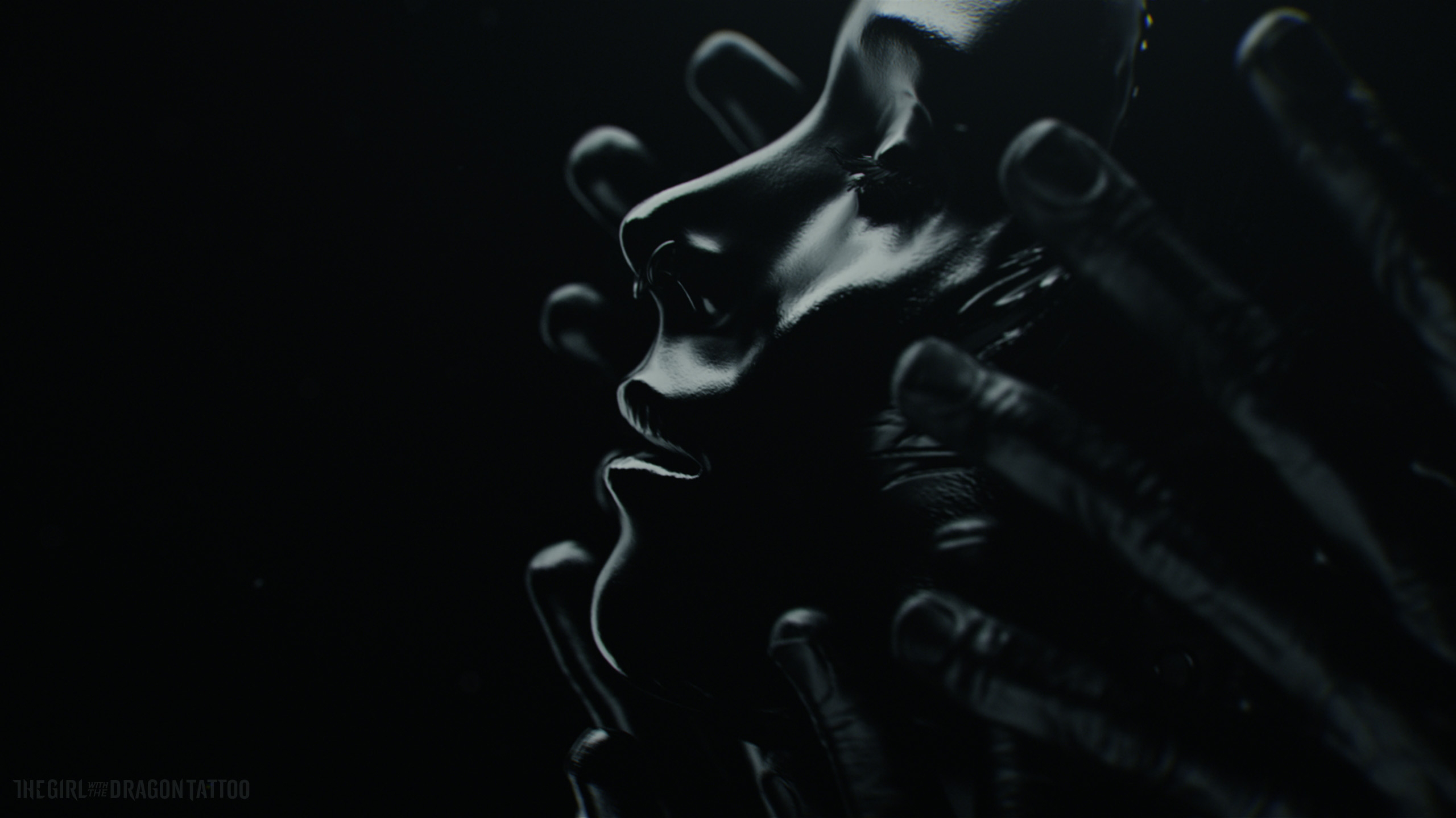 Description: A woman's face is shown in the dark with many hair clips sticking out of it's face.
