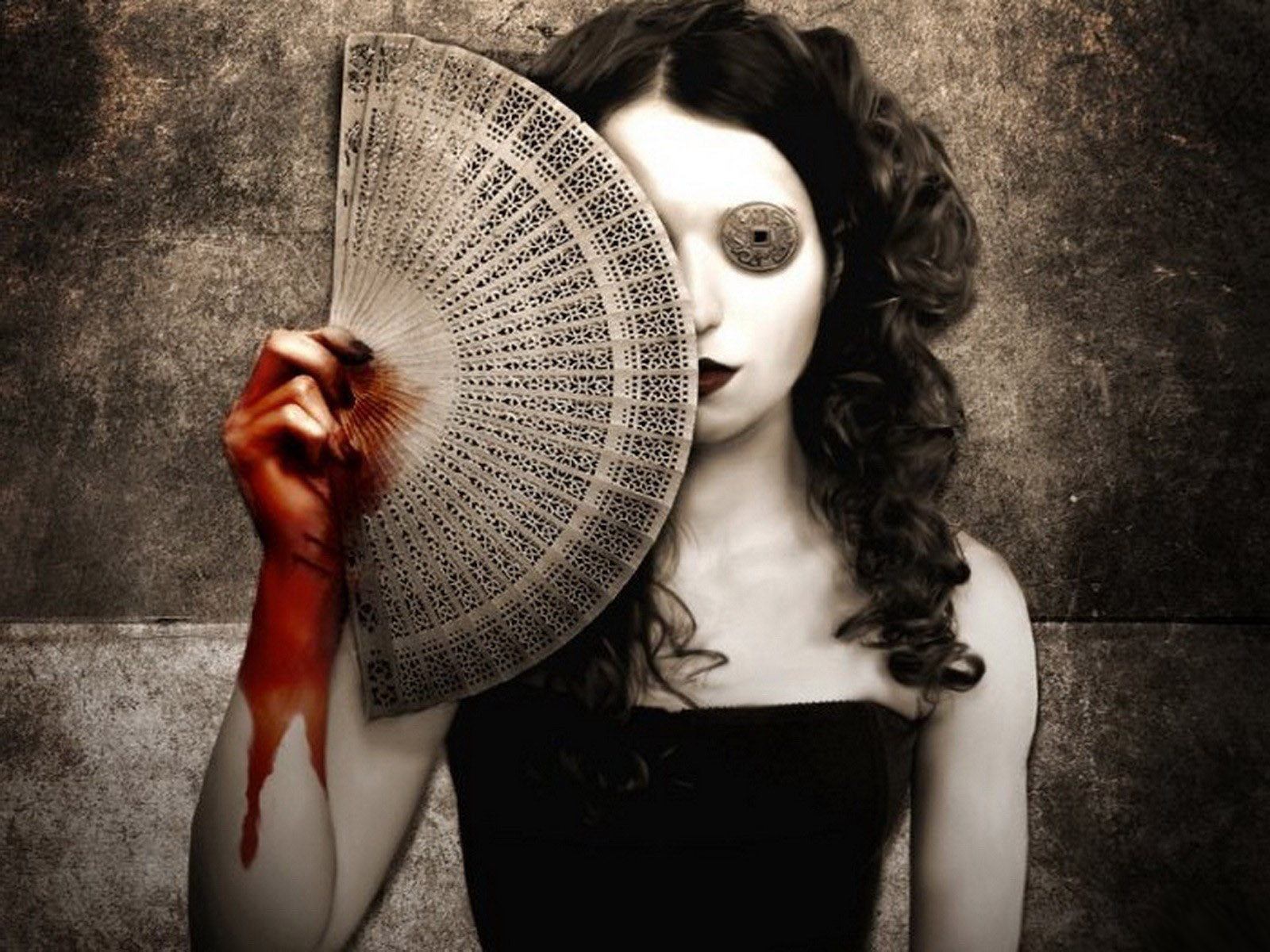 Description: A woman holding a fan with blood dripping from it's face and a bloody hand holding a bloody umbrella.
