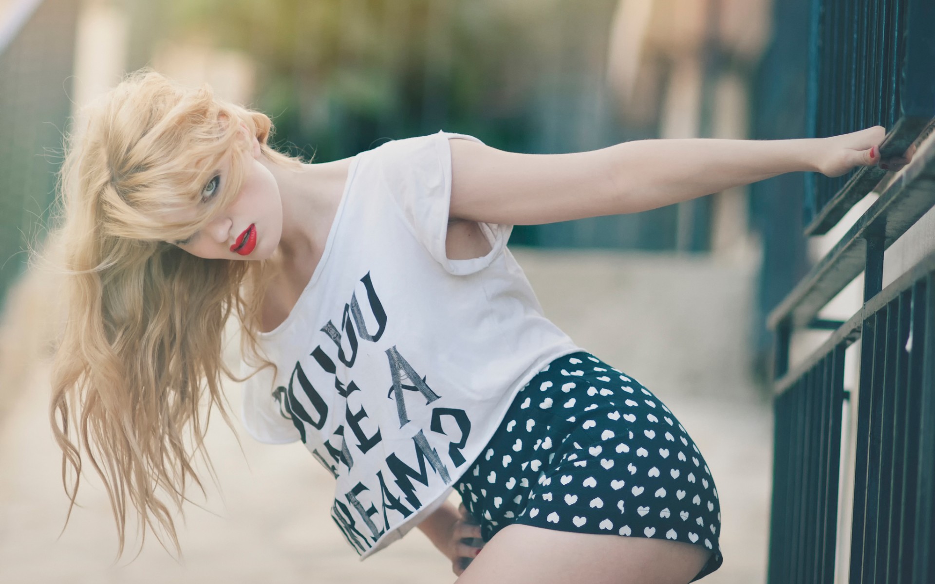 Description: A woman leaning against a fence with her hand on the rail and her leg on the wall.