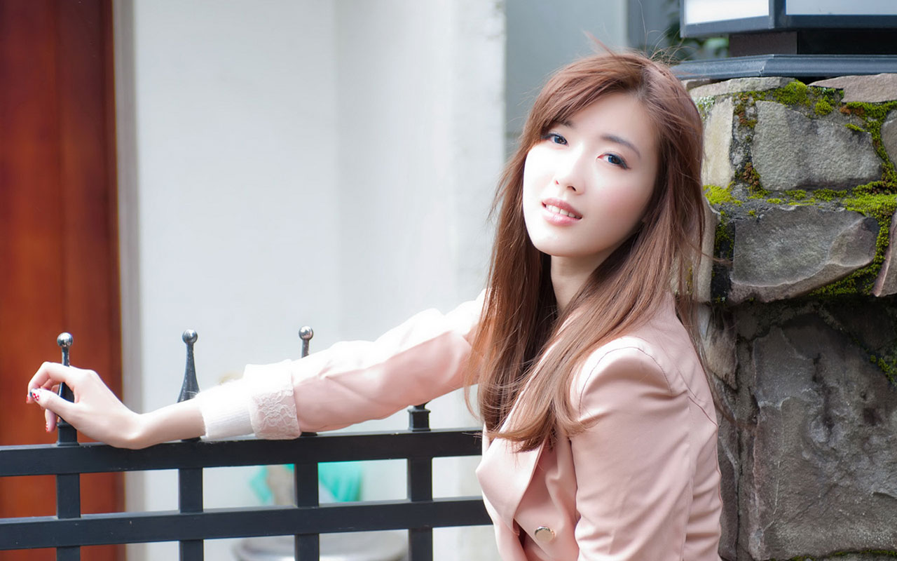 Description: A woman leaning on a fence with her hand on the rail of a building with a door in the background.