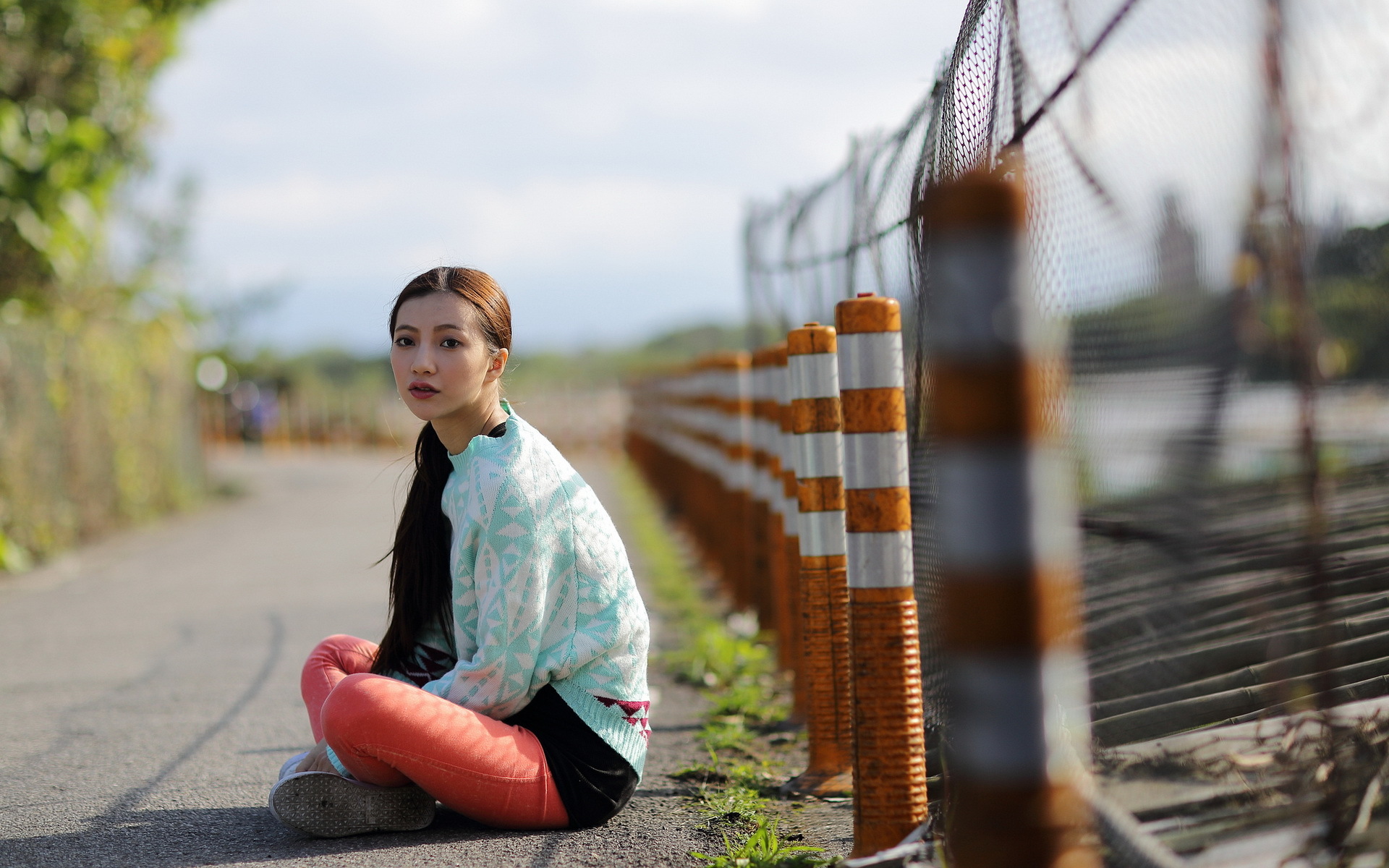 Description: A woman sitting on the ground next to a fence and a red pillow on the ground next to a fence.