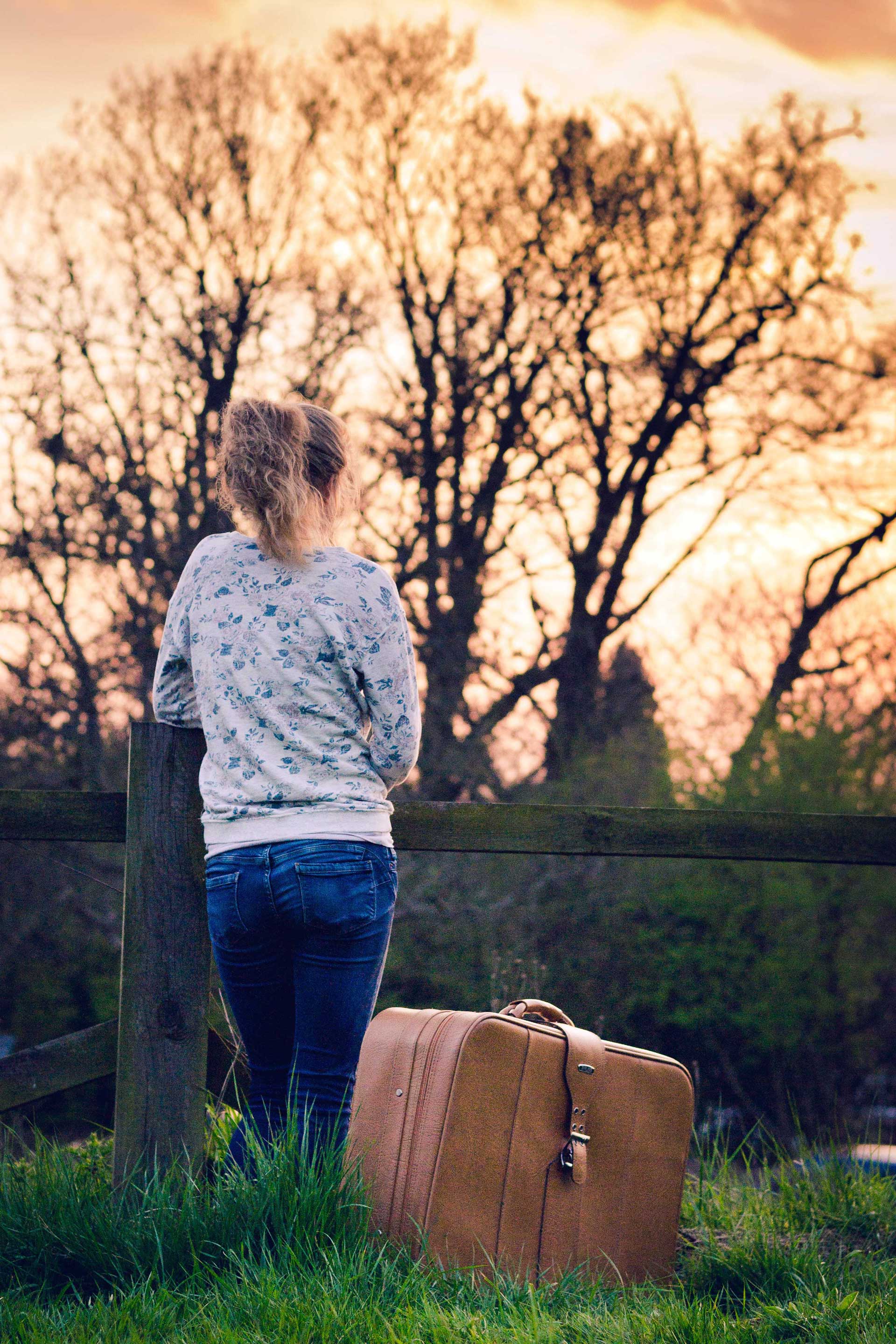 Description: A woman standing next to a fence with a suitcase in front of her and a tree in the background.