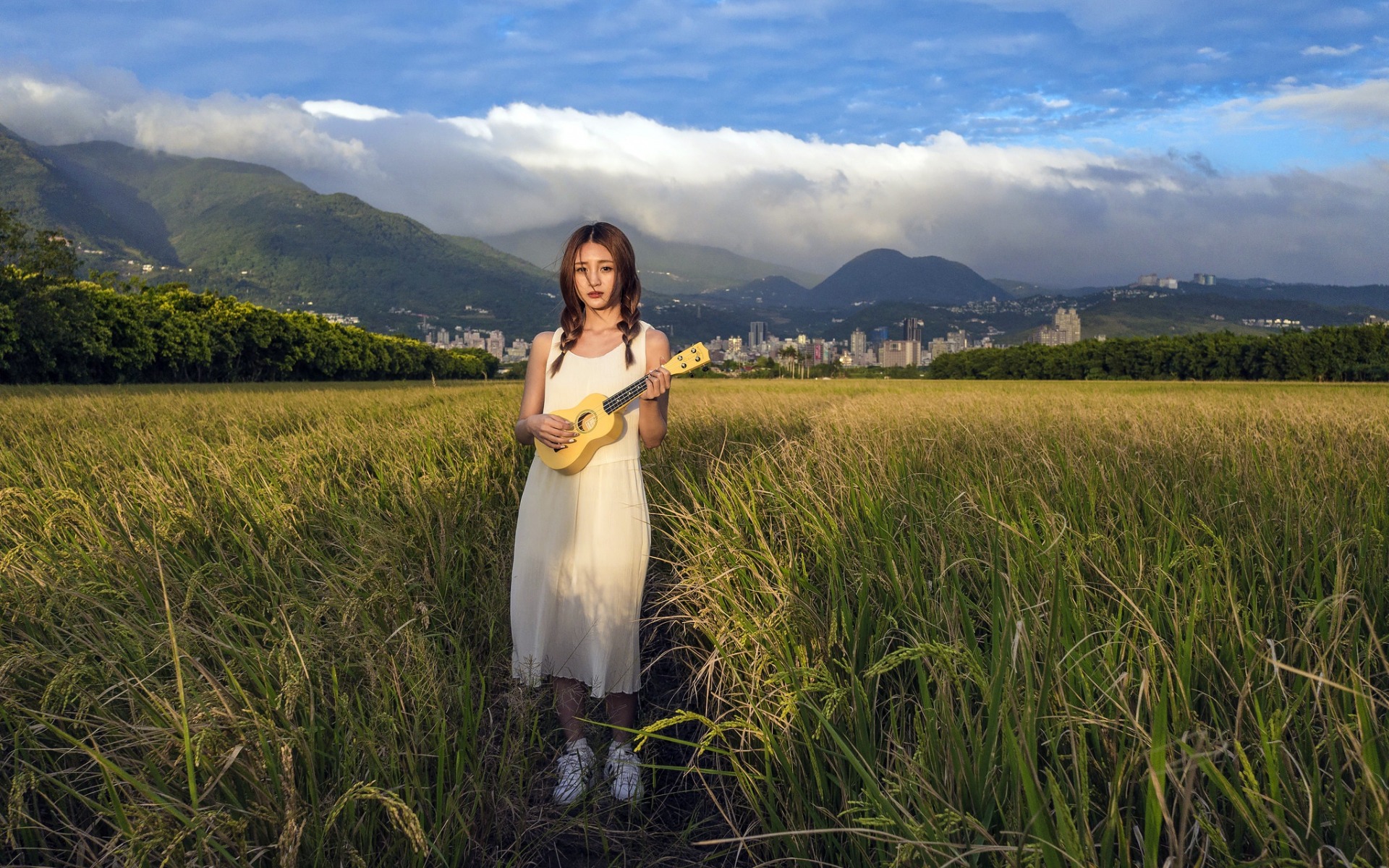 Description: A woman in a field holding a banana in her hands and a city in the background with clouds in the sky.