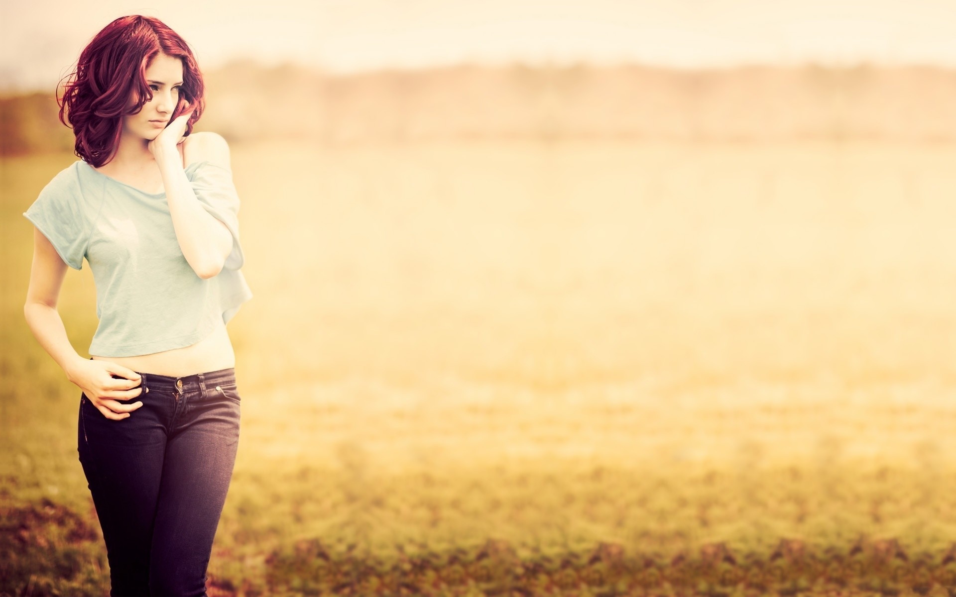 Description: A woman standing in a field talking on a cell phone with her hands behind her head and her hand on her hip.